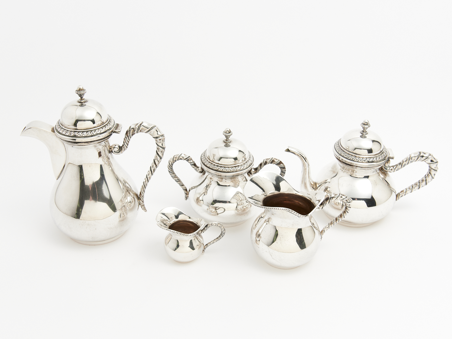A FIVE PIECE CONTINENTAL SILVER TEA AND COFFEE SERVICE 1710G, H.22CM (TALLEST), LEONARD JOEL DELIVERY SIZE: MEDIUM