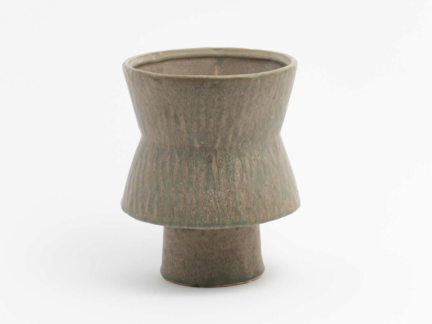 A MID CENTURY STONEWARE PLANTER / VASE WITH MATTE GREEN GLAZE H.22CM, LEONARD JOEL DELIVERY SIZE: SMALL