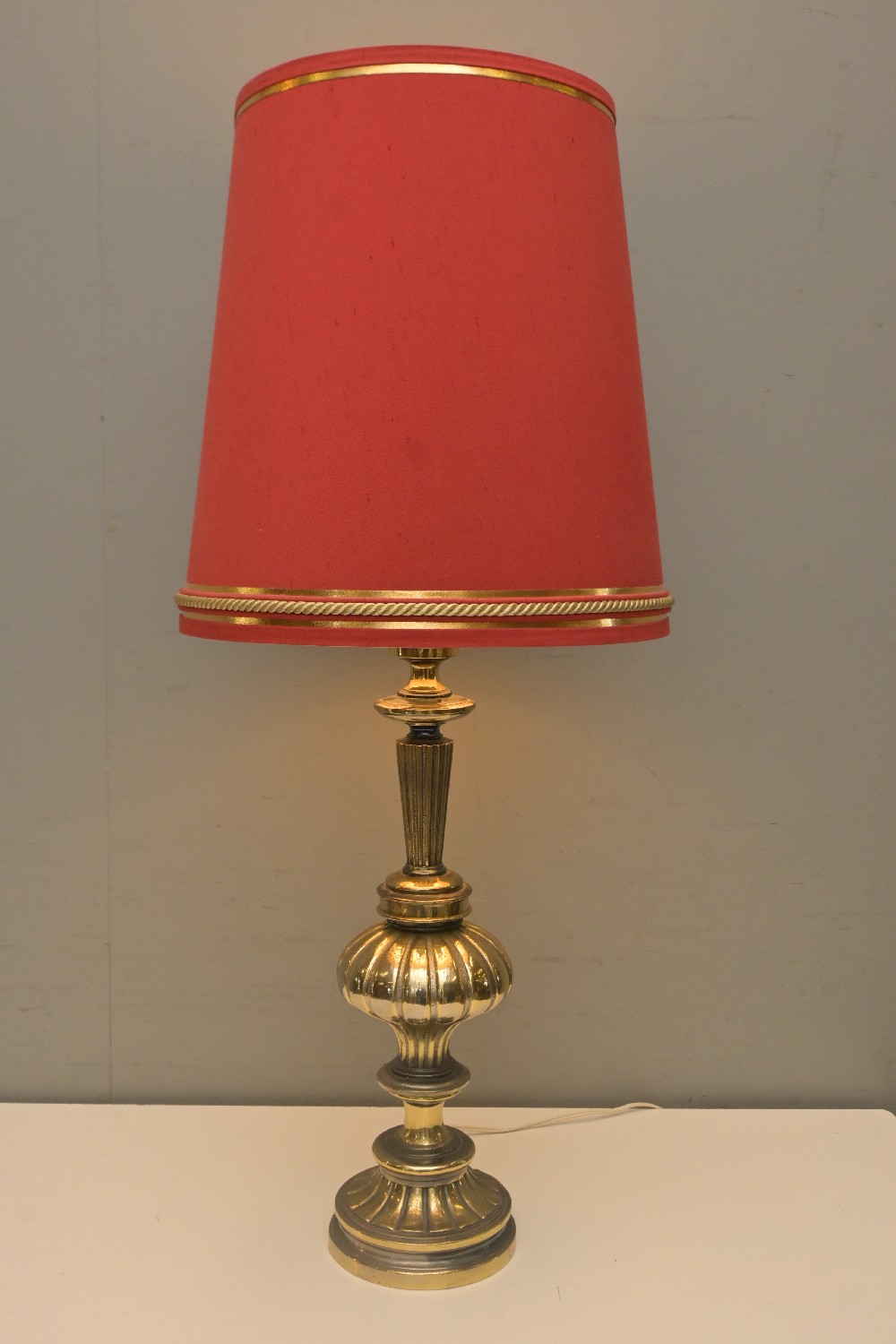 A LARGE BRASS TABLE LAMP, WITH RED SHADE (99H CM) (LEONARD JOEL DELIVERY SIZE: MEDIUM)