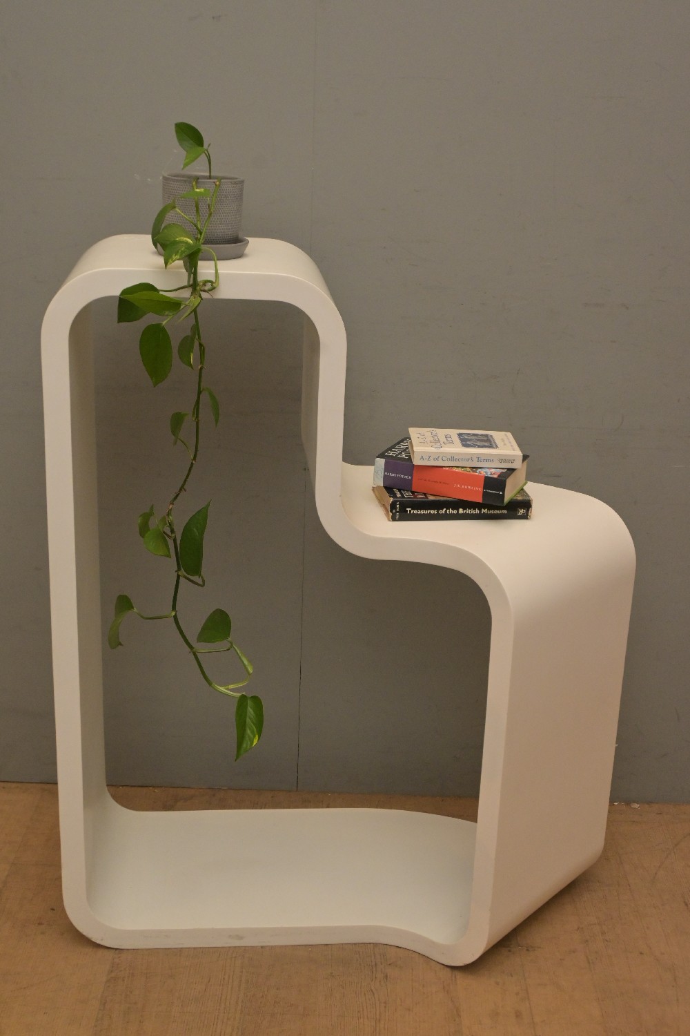 A WHITE MODERNIST CURVED SHELVING/DISPLAY UNIT (106H X 88W X 47D CM) (PLEASE NOTE THIS HEAVY ITEM MUST BE REMOVED BY CARRIERS AT THE CUSTOMER'S EXPENSE. LEONARD JOEL STAFF CANNOT ASSIST CARRYING THIS ITEM) (LARGE ITEM)