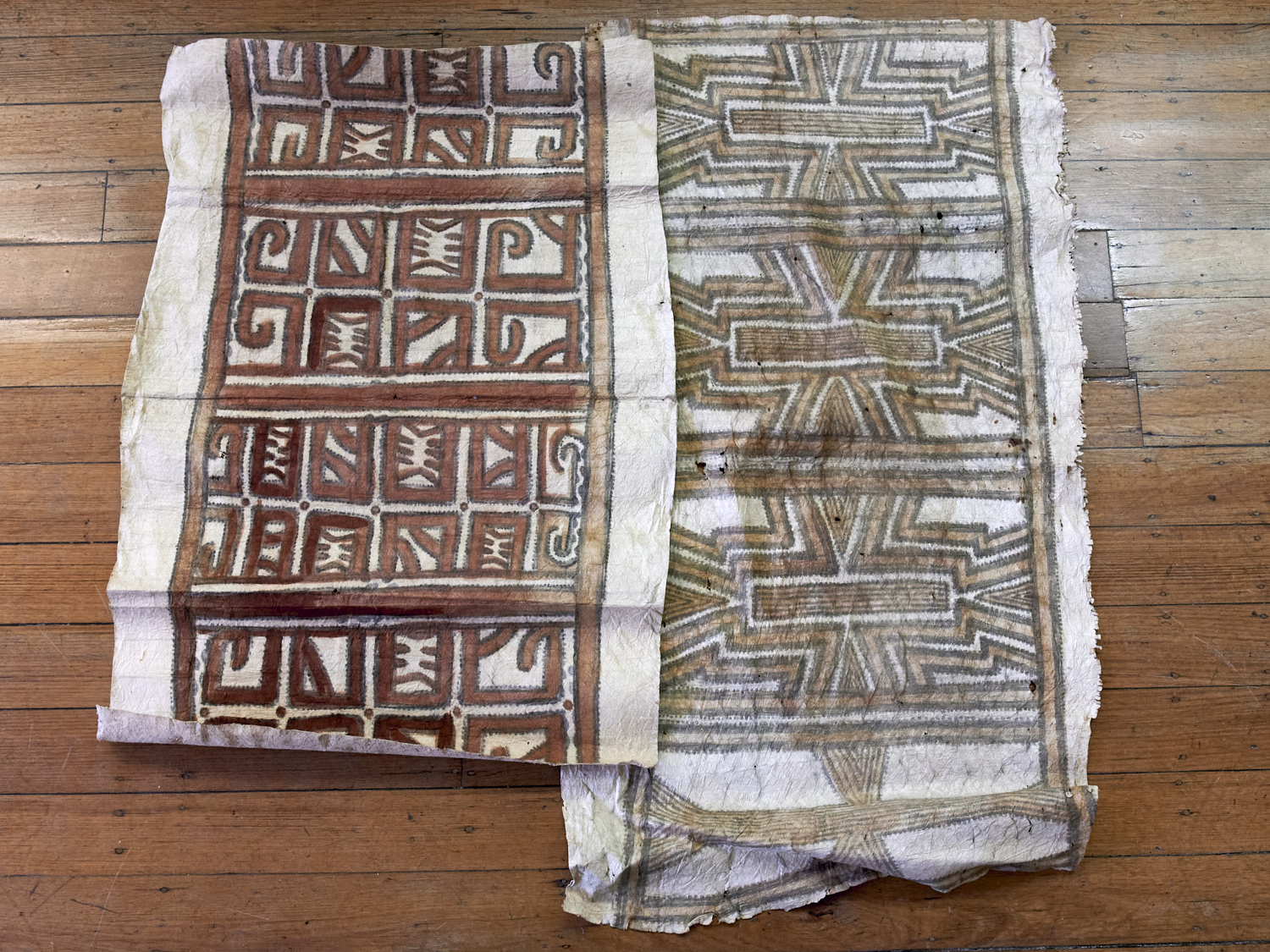TWO EXAMPLES OF TAPA CLOTH FROM PAPUA NEW GUINEA L.130CM (LONGEST), LEONARD JOEL DELIVERY SIZE: SMALL