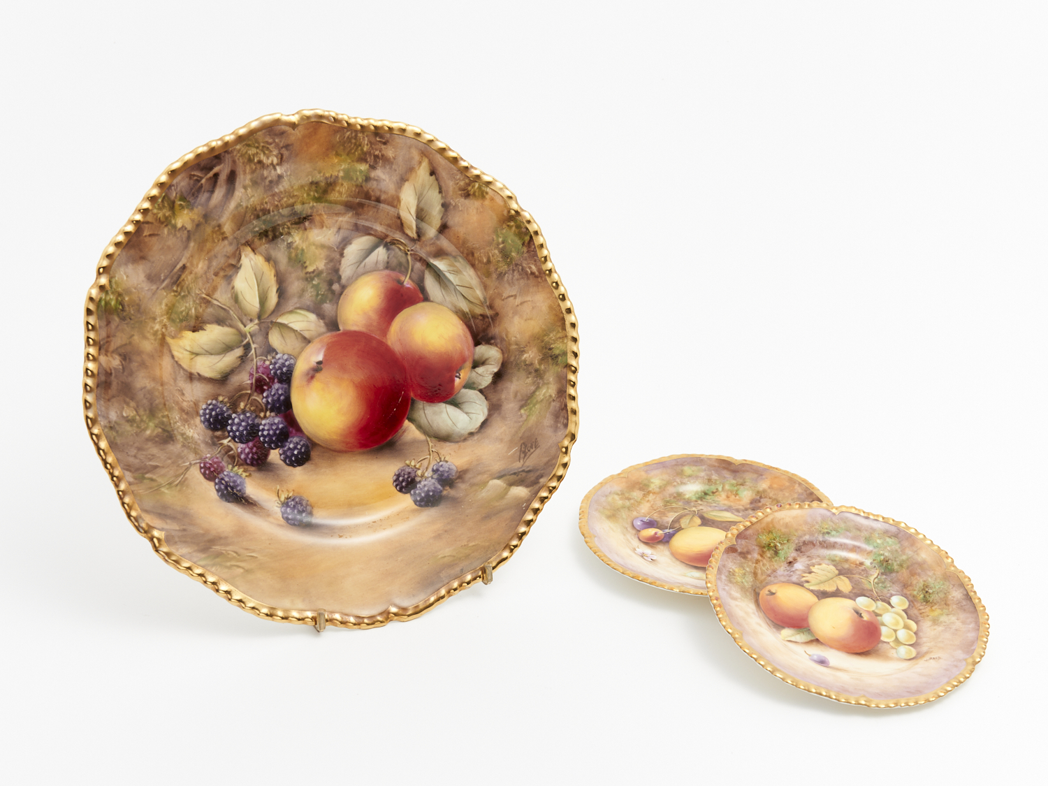 A ROYAL WORCESTER FRUIT AND BERRIES PLATE TOGETHER WITH TWO FRUIT AND BERRIES SAUCERS (SMALL SCRATCHES TO PLATE) DIA.27CM, LEONARD JOEL DELIVERY SIZE: SMALL