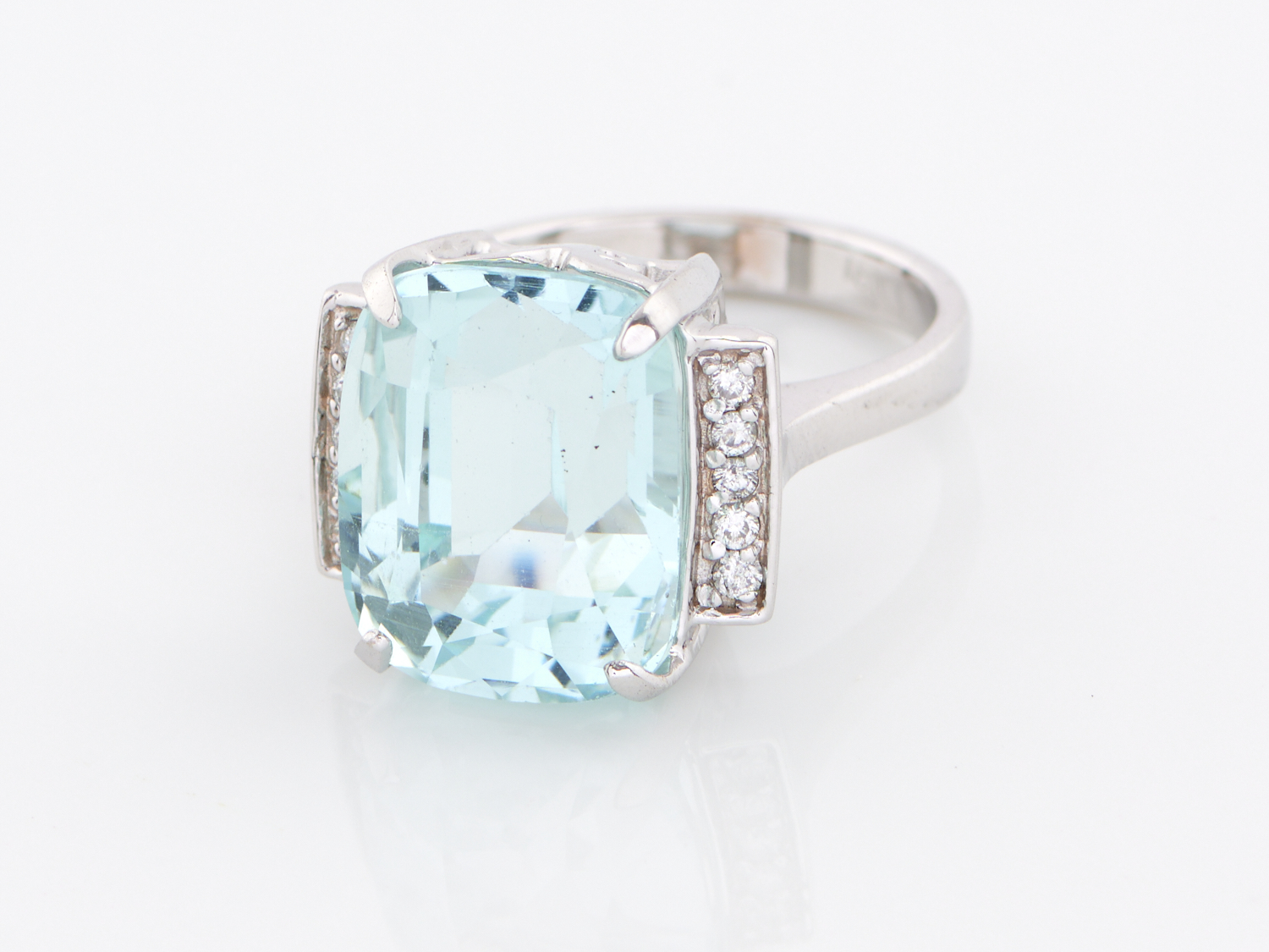 AN AQUAMARINE AND DIAMOND RING IN 18CT WHITE GOLD, THE CUSHION CUT AQUAMARINE WEIGHING 13.50CTS , THE DIAMONDS TOTALLING 0.12CTS, SIZE Q