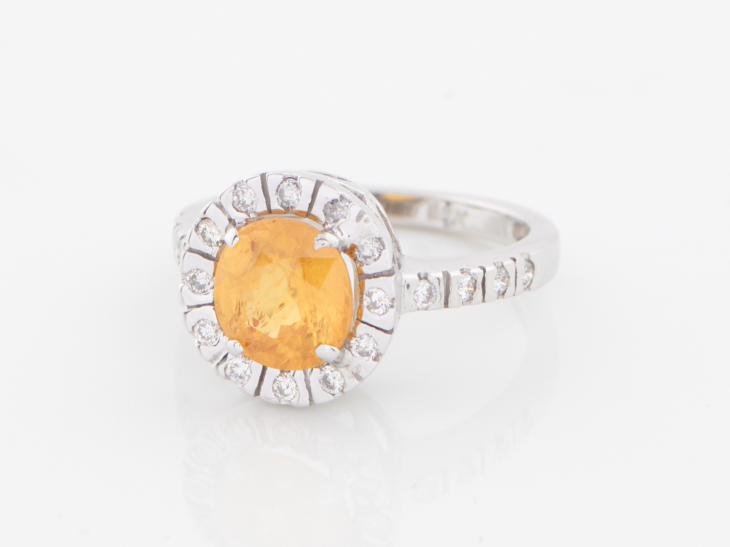 A YELLOW SAPPHIRE AND DIAMOND RING IN 18CT WHITE GOLD, THE SAPPHIRE WEIGHING 2.55CTS AND DIAMONDS TOTALLING 0.20CTS, SIZE M