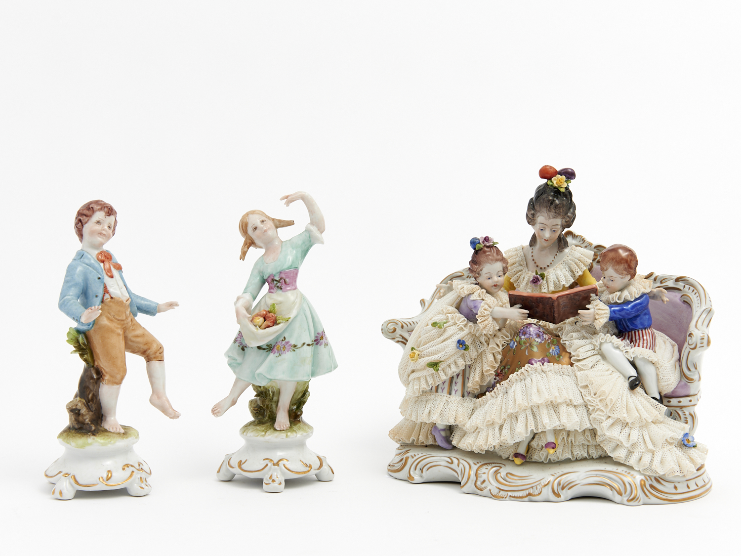 THREE CONTINENTAL PORCELAIN FIGURES H.21CM, (ONE A/F), LEONARD JOEL DELIVERY SIZE: SMALL