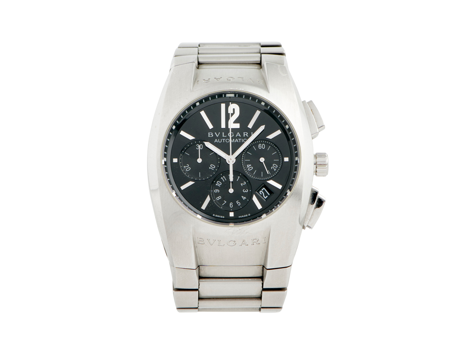 Case: brushed and polished tonneau form case with BVLGARI engraved bezel, screw down back