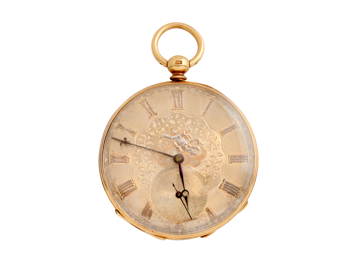 Dial: gilt, raised Roman numerals, subsidiary seconds, enclosing a scalloped scene of a torch bearing winged cherub