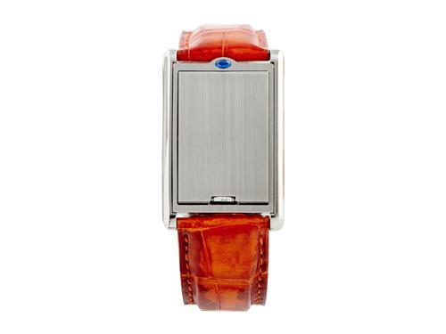 Case: brushed and polished stainless steel pivoting rectangular case with crown at 12 and cabochon set tab above, embossed Cartier logos inside the outer case