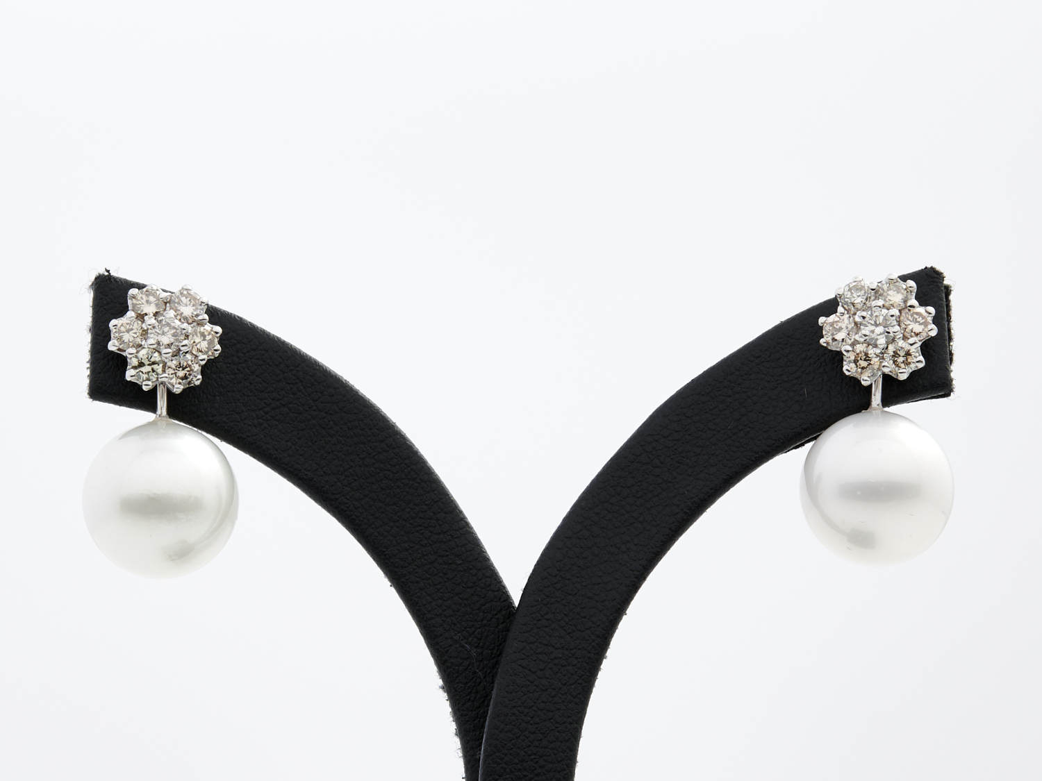 A PAIR DETACHABLE SOUTH SEA PEARL AND DIAMOND EARRINGS IN 18CT WHITE GOLD, THE DIAMONDS TOTALLING 1.70CTS WITH PEARLS MEASURING 13MM, TO POST AND BUTTERFLY FITTINGS
