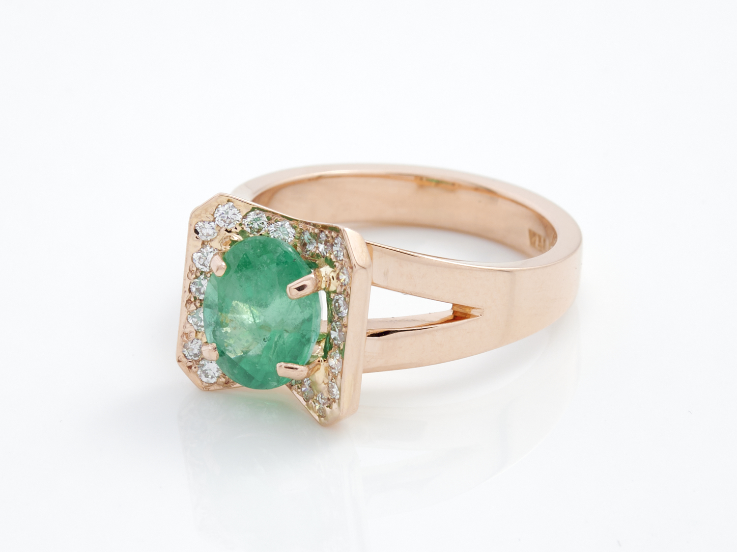 AN EMERALD AND DIAMOND RING IN 18CT ROSE GOLD, THE EMERALD WEIGHING 1.94CTS WITH DIAMONDS TOTALLING 0.24CTS, SIZE N, ACCOMPANIED BY A VALUATION