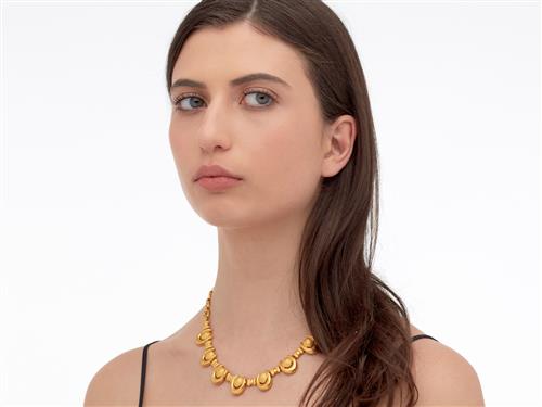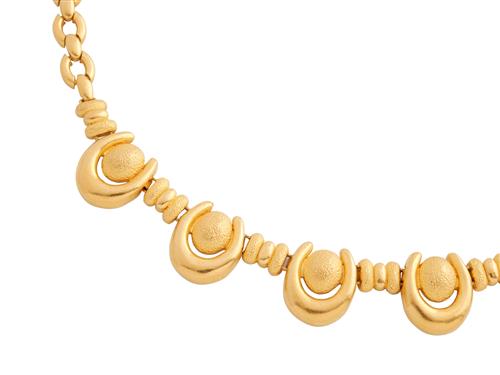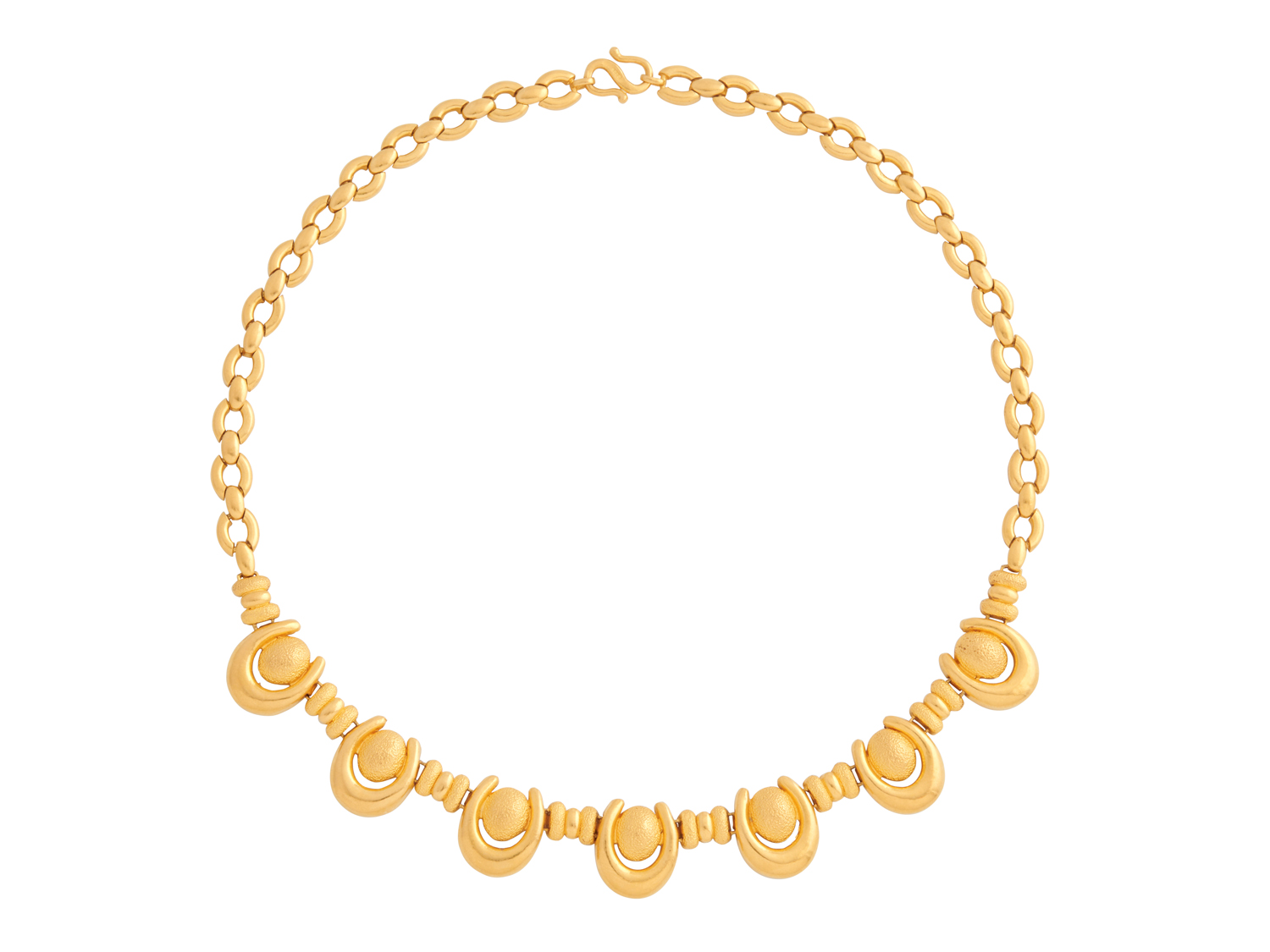 Comprising a central panel of textured links and horseshoe shaped links, to an integral link chain completed by an s-hook clasp, length approximately 450mm, gross weight approximately 76.4 grams.