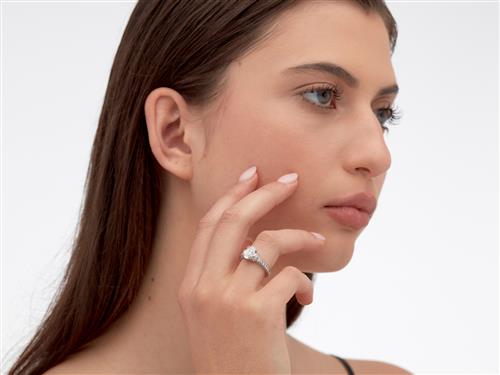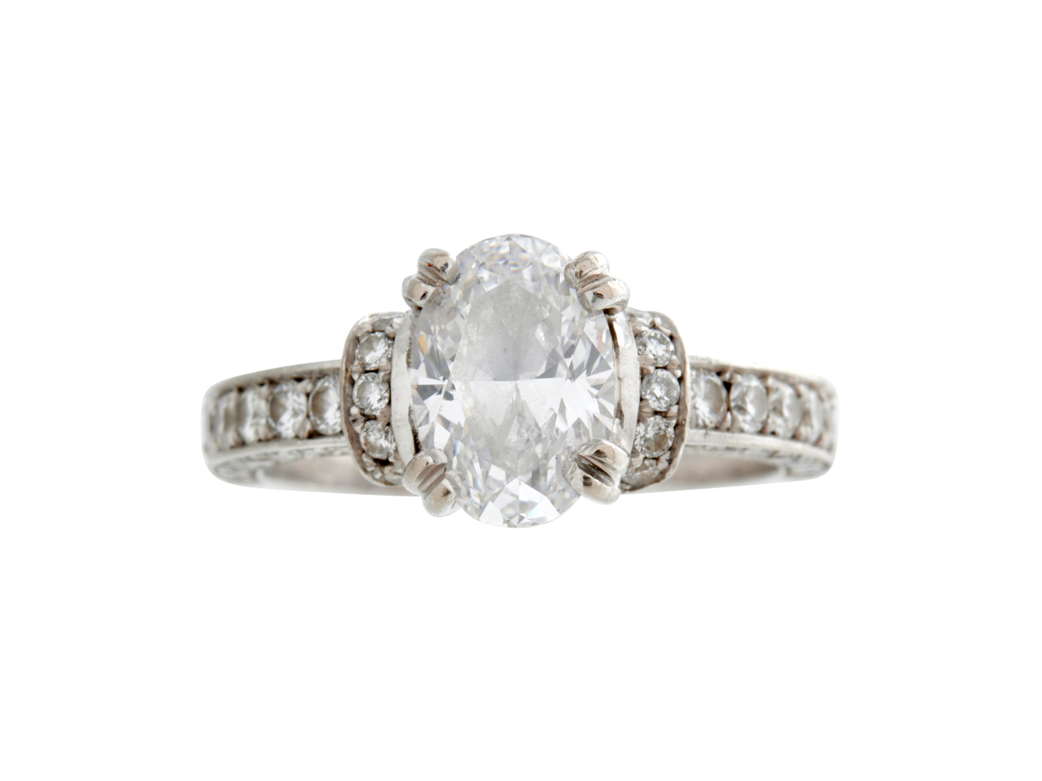 Claw-set with an oval-cut diamond weighing approximately 1.25 carats, the shoulders detailed with brilliant-cut diamonds together weighing approximately 0.80 carats, size L.
