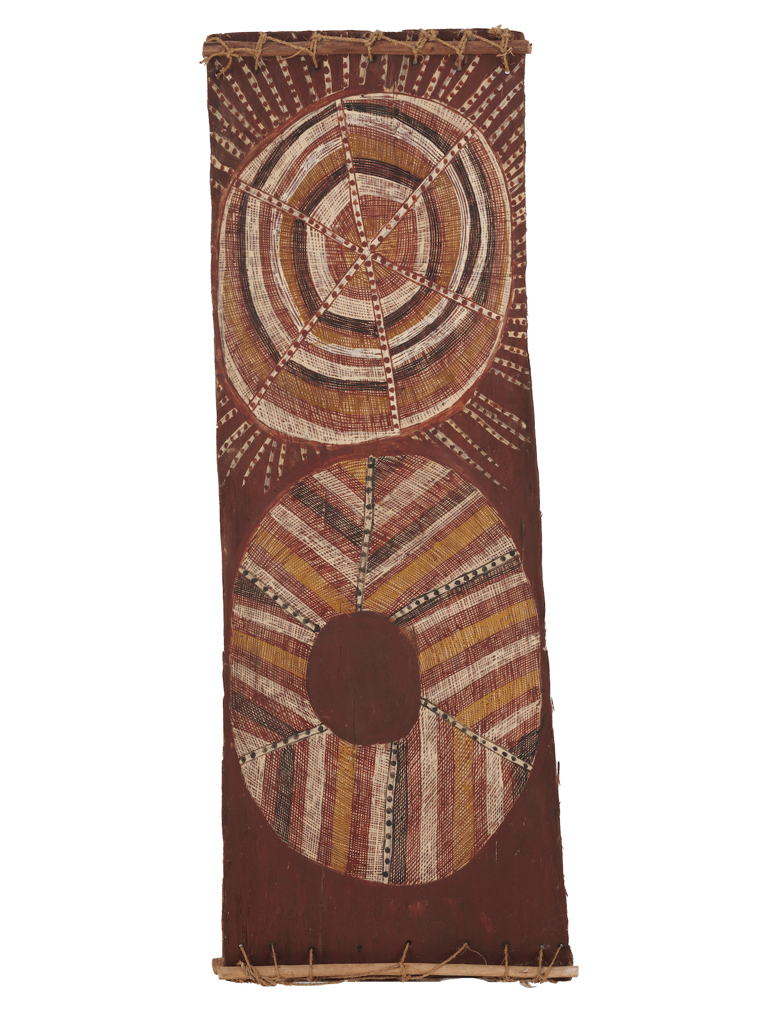 "The abstract images represent the full- Dird in Kununjku language and the Djang site (place of power) associated with it called Dirdbim, which is located near Yikkerrakkal where the artist lives.