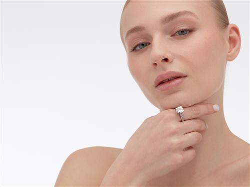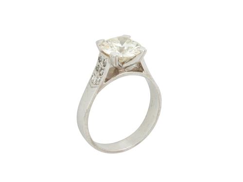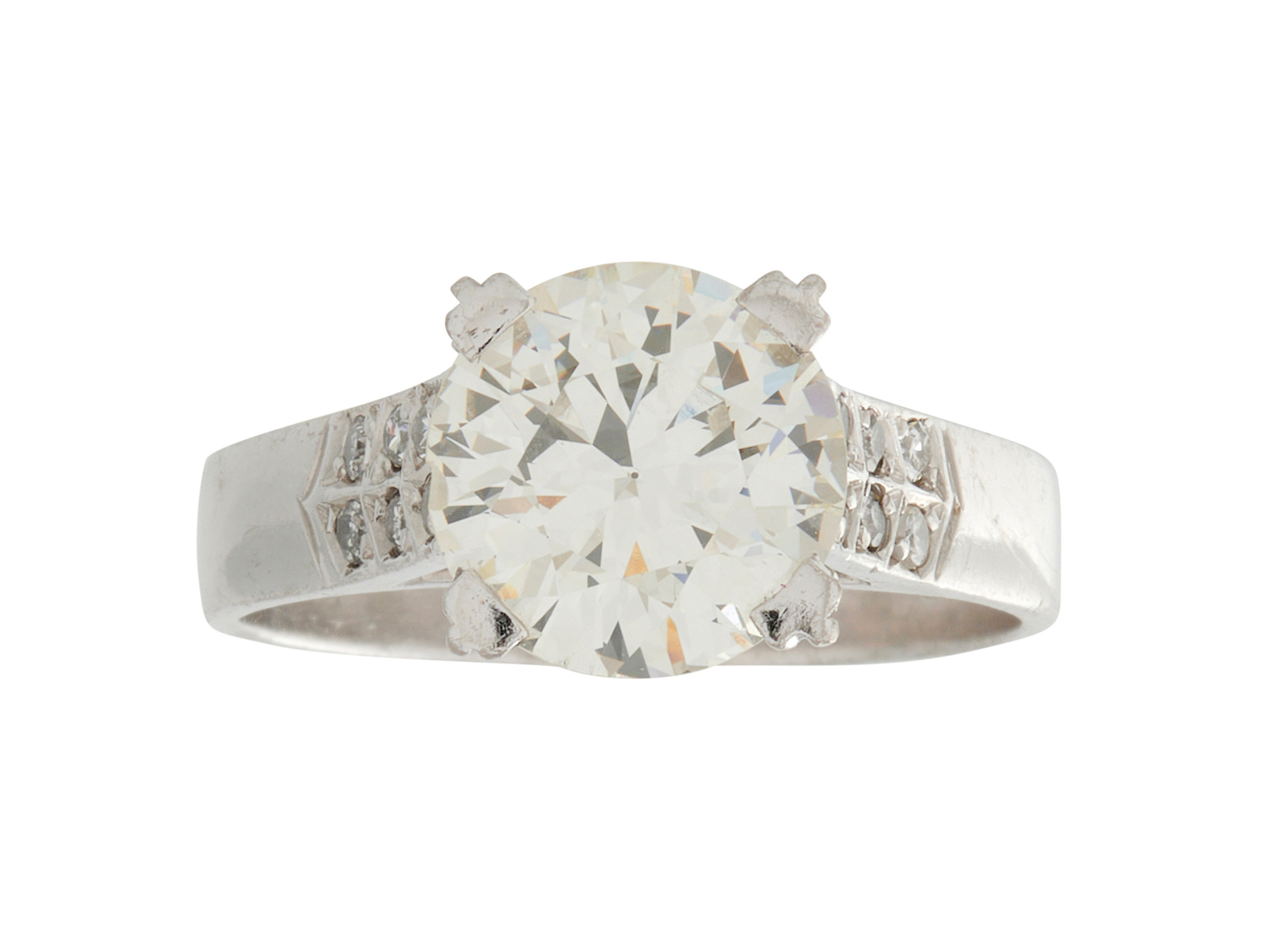 Claw-set with a brilliant-cut diamond weighing approximately 3.25 carats, to shoulders grain-set with single-cut diamonds together weighing approximately 0.18 carats, size R.