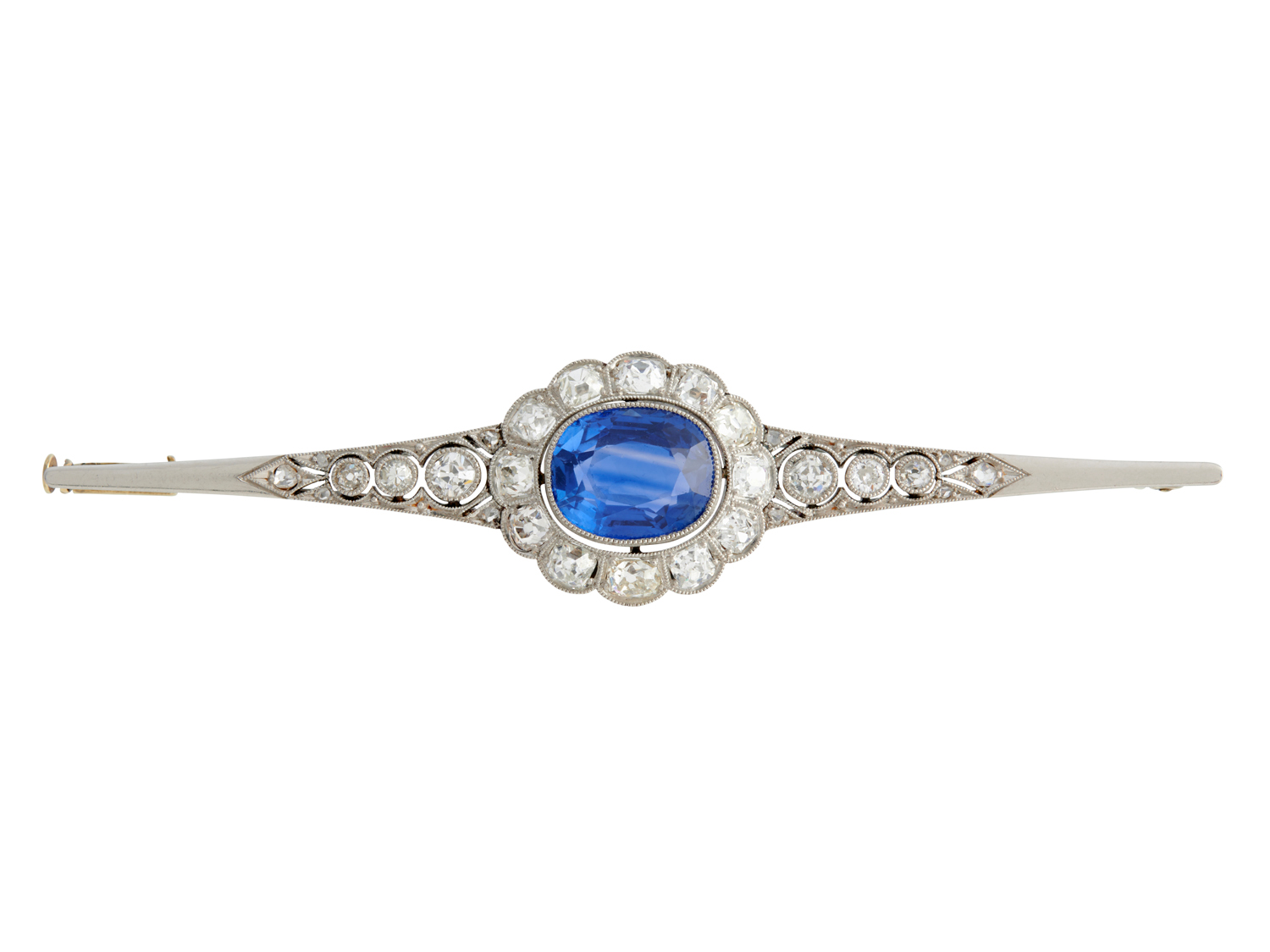 Of bar design, centring an oval-cut sapphire weighing approximately 4.50 carats within a surround of old mine-cut diamonds, flanked by pierced panels detailed with further diamonds, the diamonds together weighing approximately 1.76 carats, length 78mm, gross weight approximately 7.5 grams.