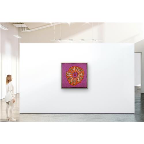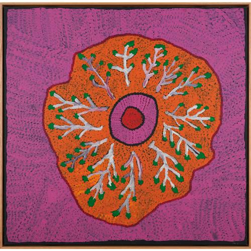 "This painting is my mother's country. When me and my brother were young boys we always be together, playing, going out hunting. Every morning we used to go out looking for black berries, hunting kangaroo, goannas, emus etc."