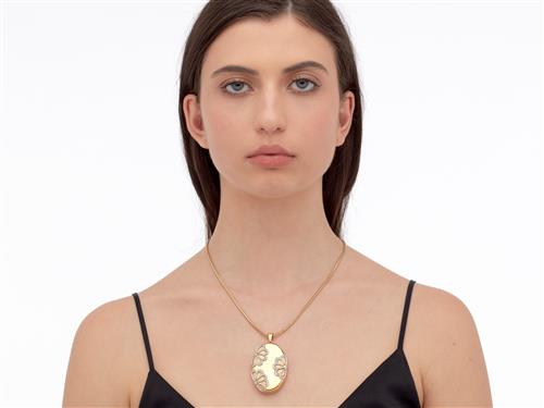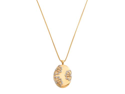 The hinged oval locket, set to the front with open floral motifs detailed with single-cut diamonds, suspended from a snake link chain completed by a parrot clasp, pendant length 50mm, width 35mm, chain length 600mm, gross weight approximately 45.4 grams.