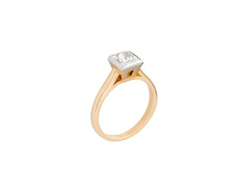Centring a rub-over set princess-cut diamond weighing approximately 1.30 carats, size K.