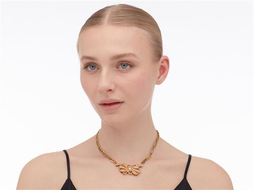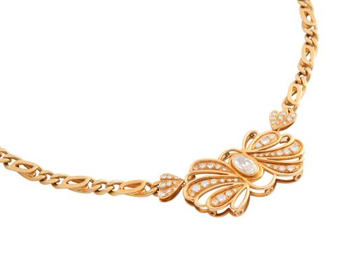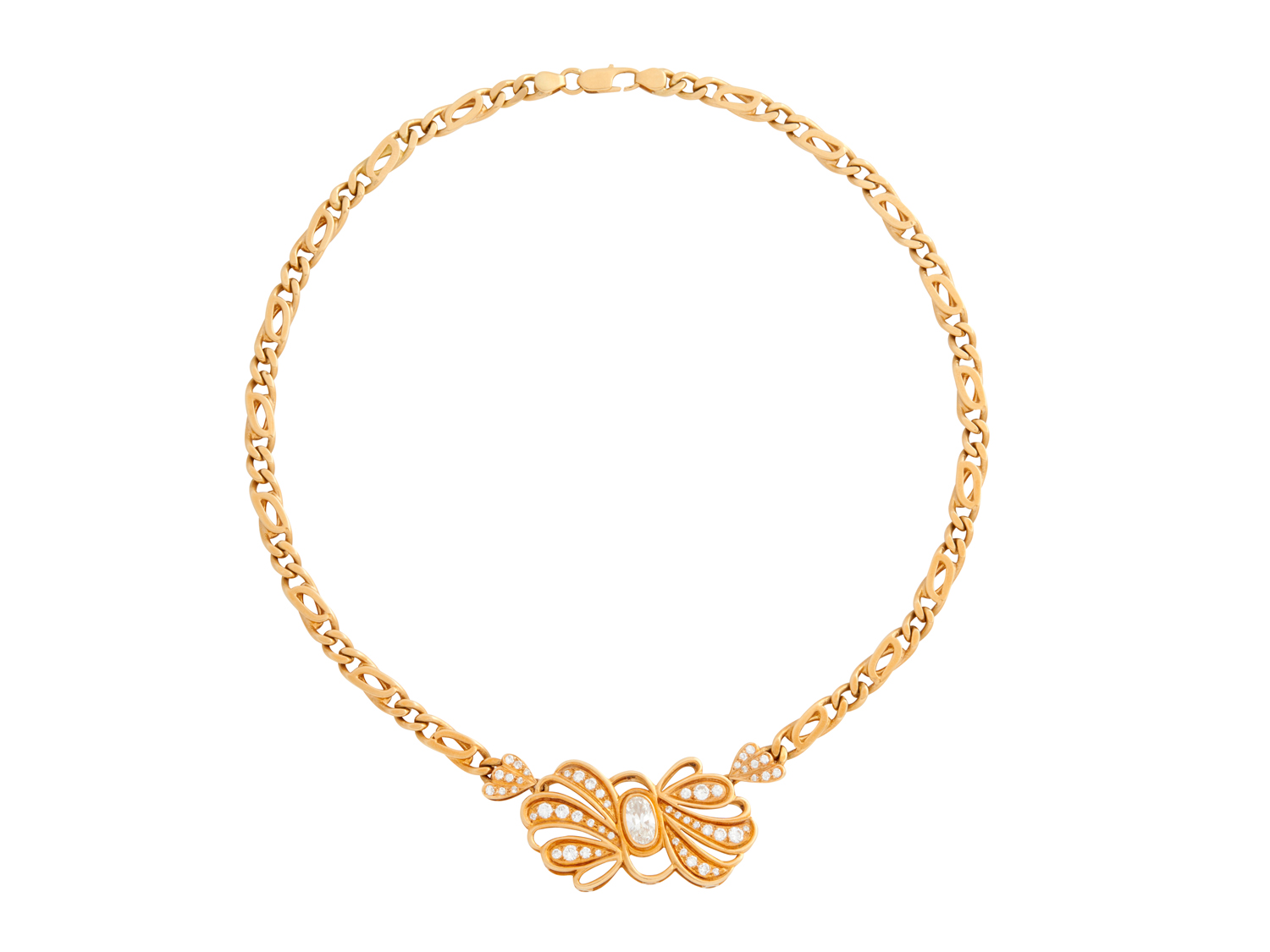 Centring a stylised bow motif set with a bezel-set oval-cut diamond weighing approximately 1.05 carats within a surround of grain-set brilliant-cut diamonds together weighing approximately 0.95 carats, to an integral flat figaro link chain completed by a parrot clasp,