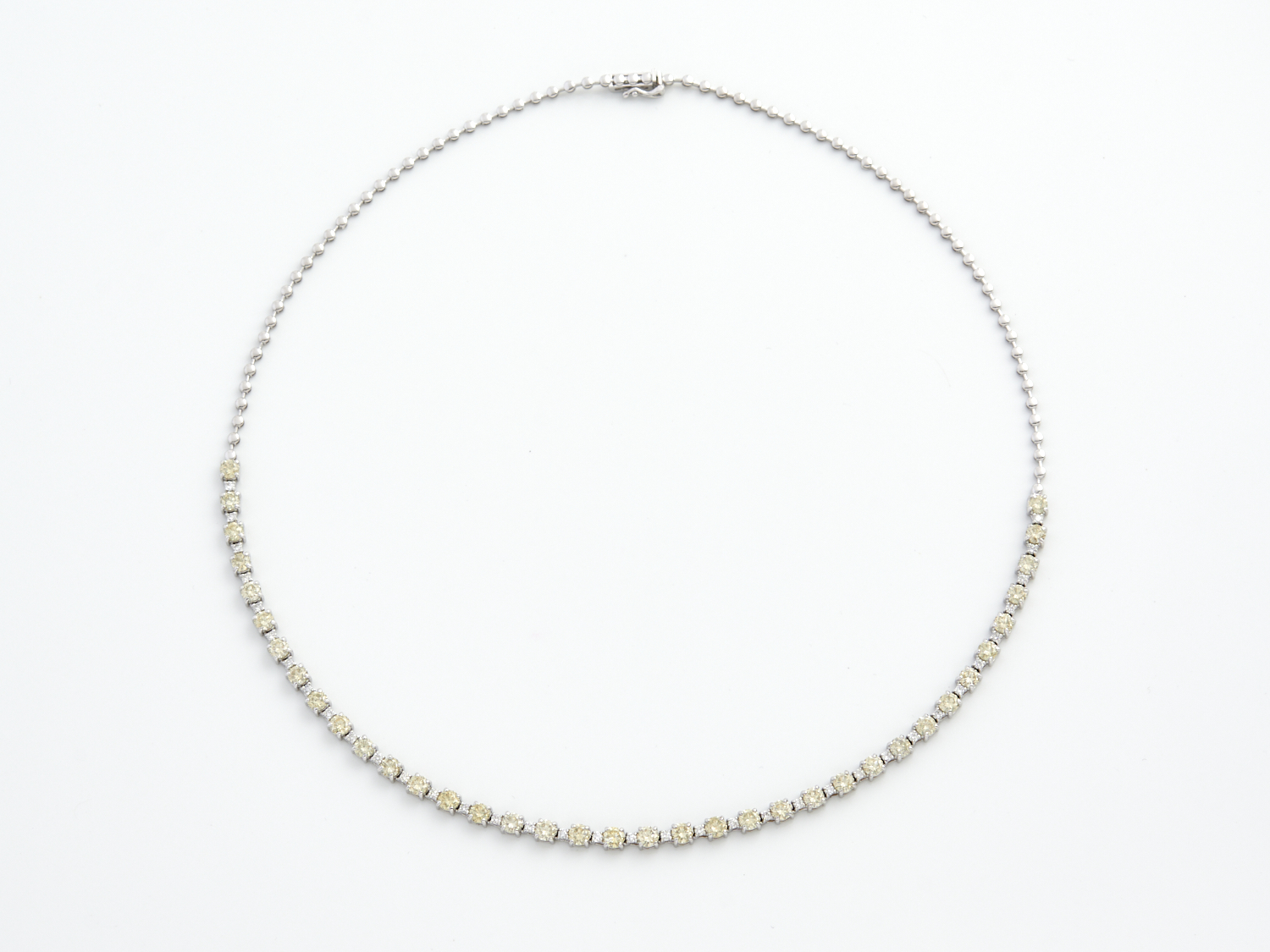 A DIAMOND NECKLACE IN 18CT WHITE GOLD, THE DIAMONDS TOTALLING 7.55CTS VS-SI, LIGHT YELLOW AND F/G, ACCOMPANIED BY A VALUATION