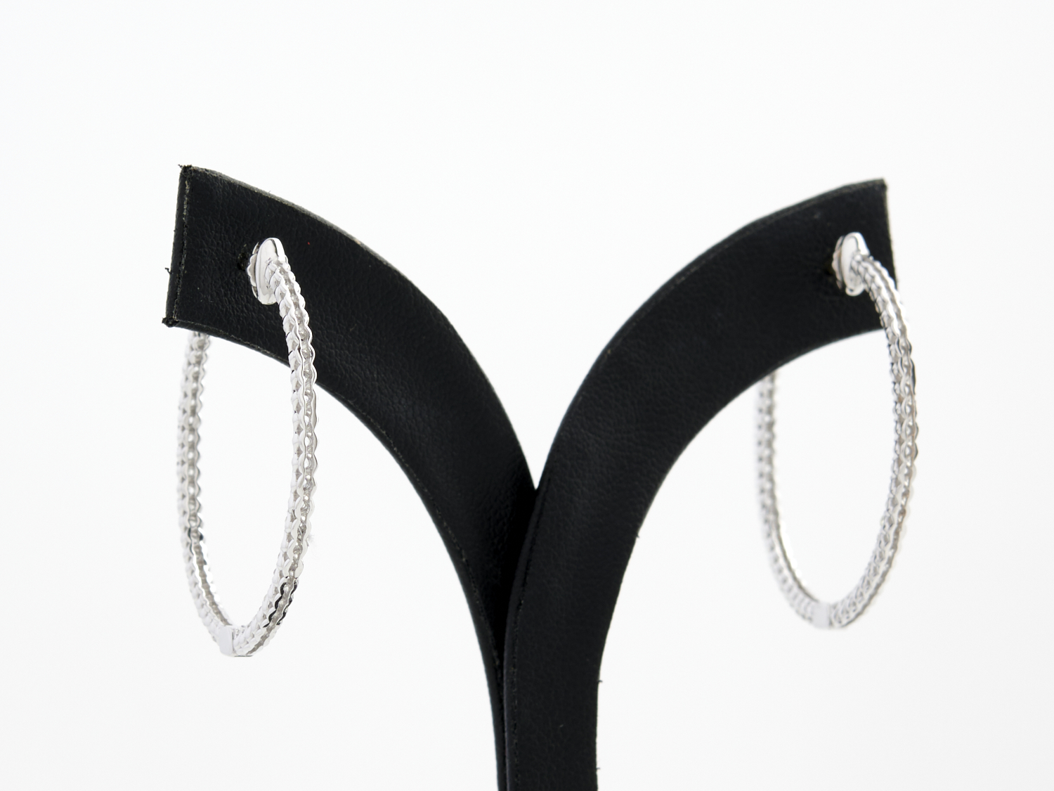 A PAIR OF DIAMOND HOOP EARRINGS IN 18CT WHITE GOLD, THE DIAMONDS TOTALLING 1.75CTS, TO SCREW BACK FITTINGS, LENGTH 32MM