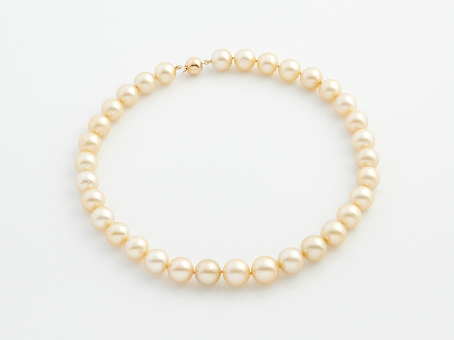 A STRAND OF GOLDEN SOUTH SEA PEARLS TO A BALL CLASP IN 14CT GOLD, THE PEARLS MEASURING 12 - 14.2MM, 450MM