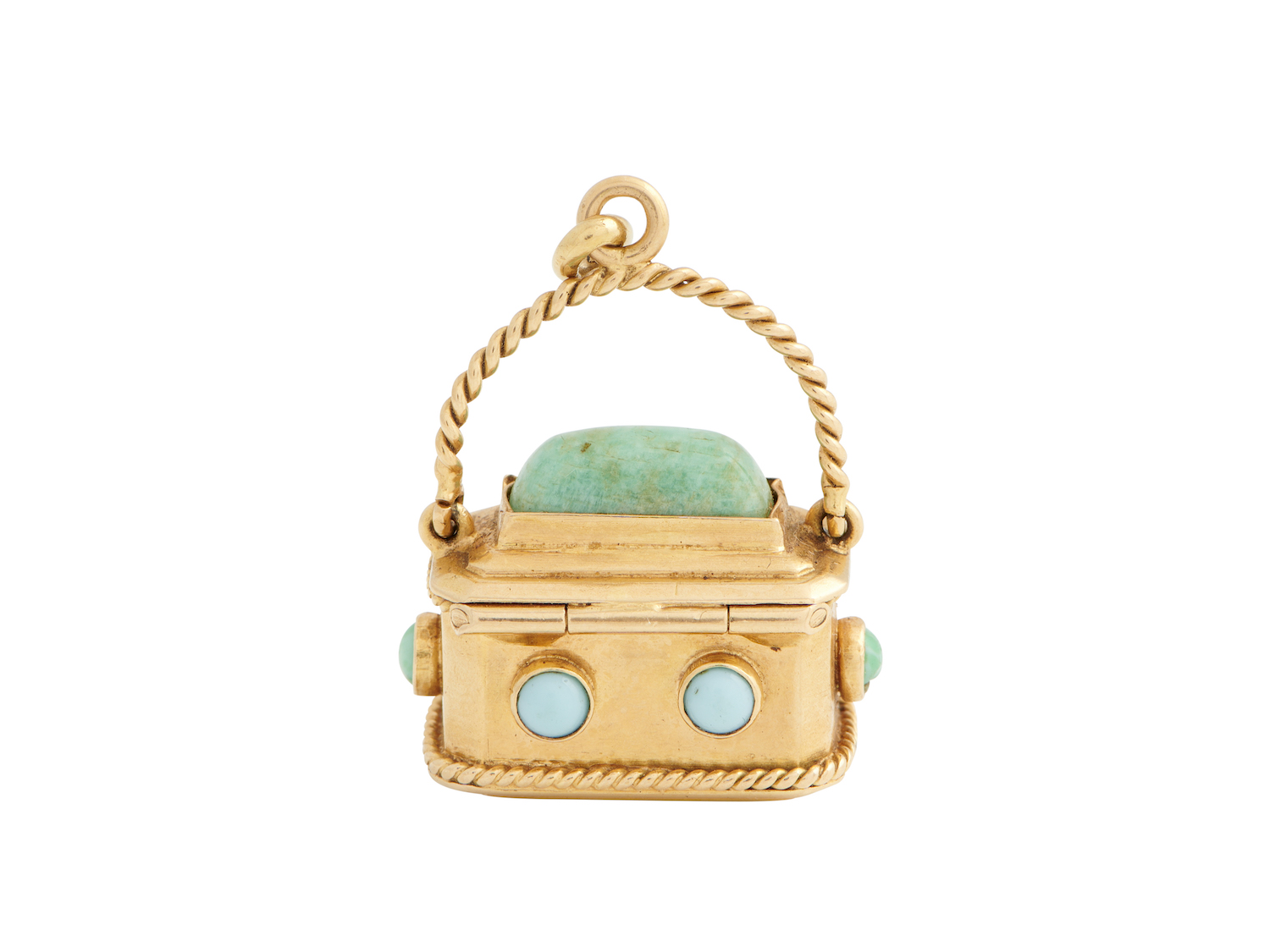 Modelled as a hinged opening chest, accented to the top, front and sides with cabochon turquoise, mounted in 18ct gold, length 32mm, width 22mm, gross weight approximately 8 grams.