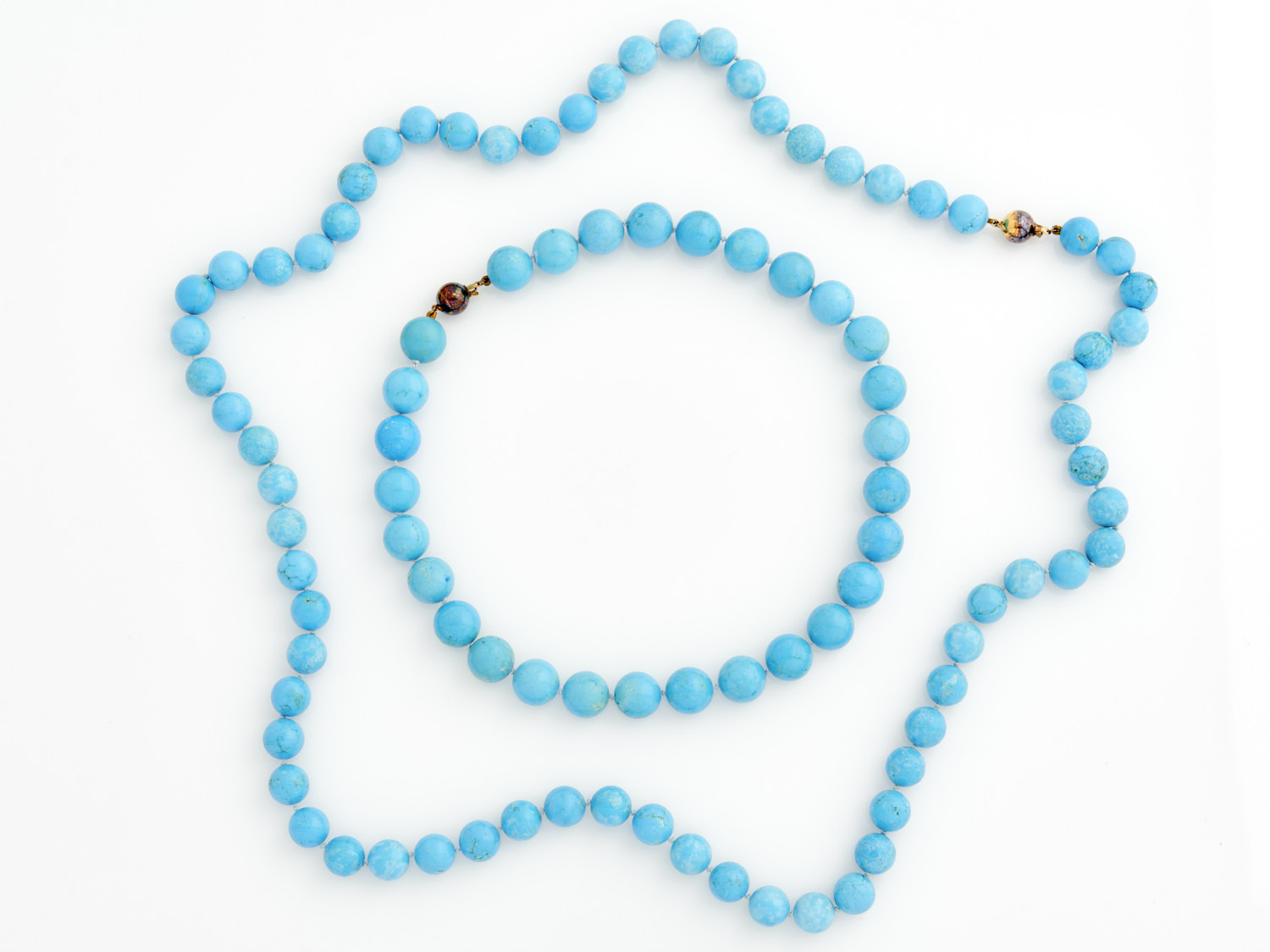 TWO STRANDS OF TURQUOISE BEAD TO CLASPS IN GOLD PLATE, 940MM AND 460MM