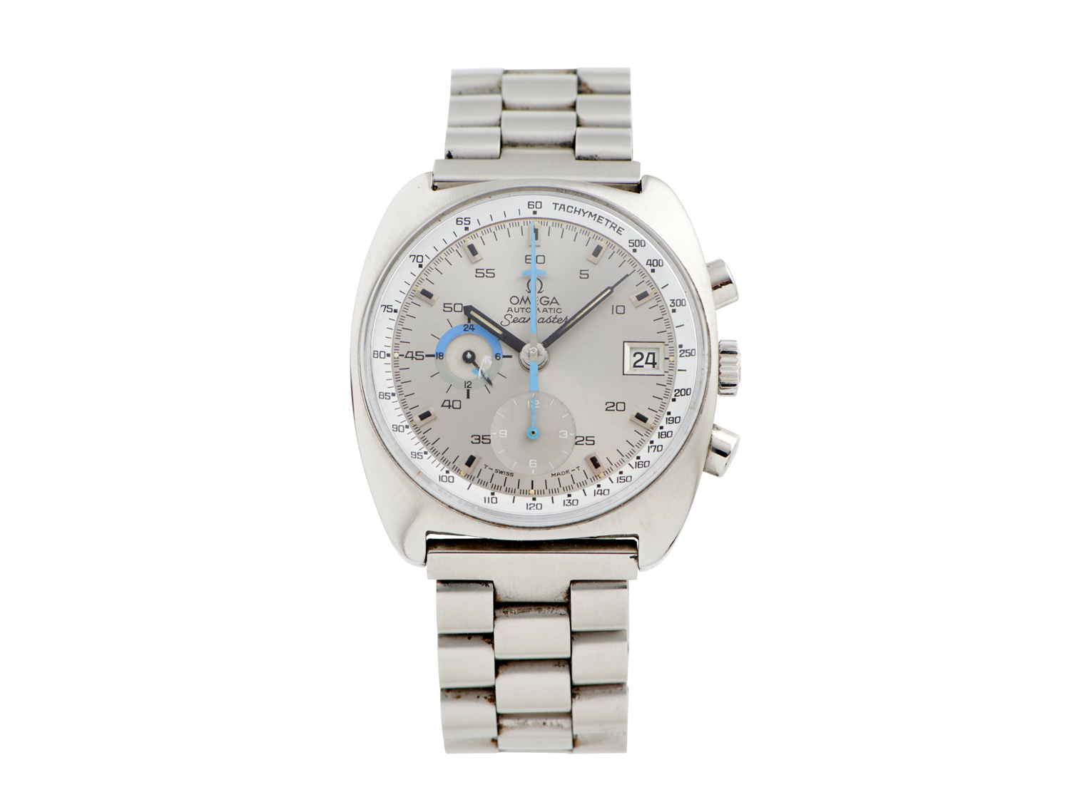 Dial: silvered, applied baton indexes, subsidiary dials for constant seconds combined with 24-hour indication, 12-hour register, 60 minute register indicated by a central blue arrow hand, aperture for date at 3, sunken outer tachometer scale