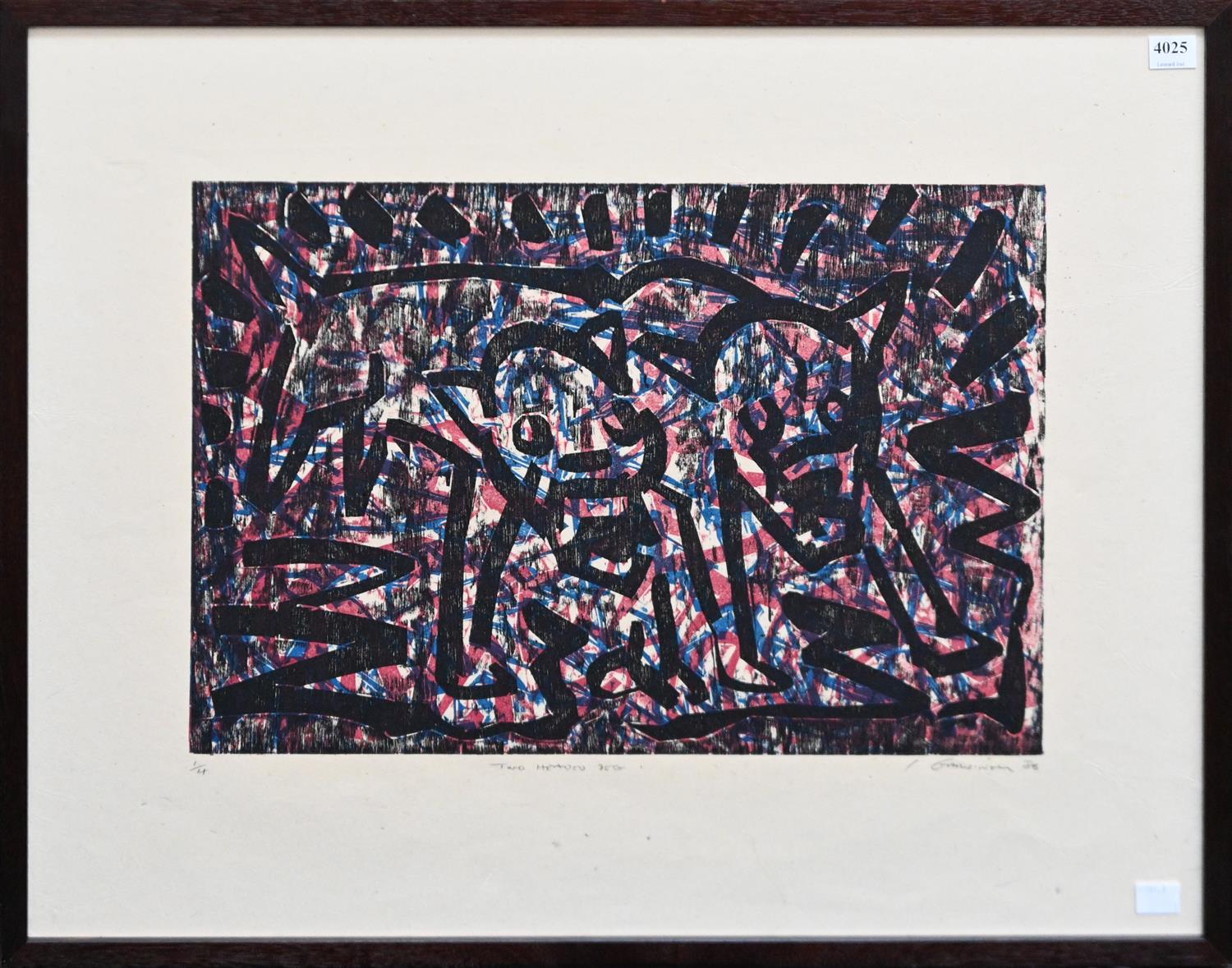 § IAN GARDINER, TWO HEADED DOG 1986, COLOURED WOODCUT ED. 1/4, SIGNED, DATED, EDITIONED AND TITLED BELOW IMAGE, 30 X 45.4CM (IMAGE), FRAME SIZE: 51.5 X 66CM