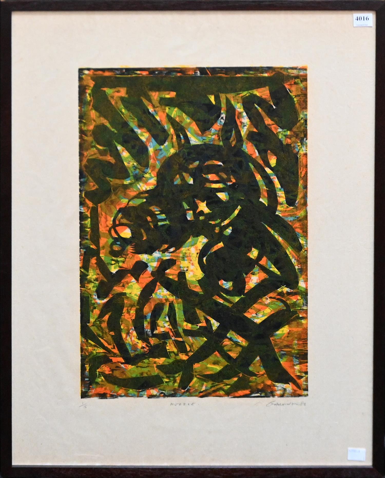 § IAN GARDINER, MUZZLE 1986, COLOURED WOODCUT ED. 1/5, SIGNED, DATED, EDITIONED AND TITLED BELOW IMAGE, 45.5 X 30CM (IMAGE), FRAME SIZE: 66 X 51.5CM