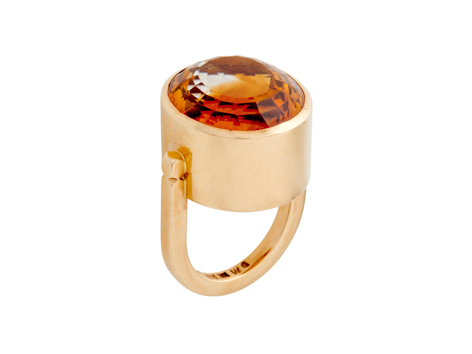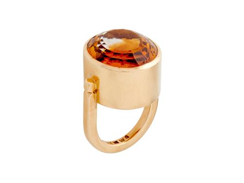 Centring an oval-cut citrine weighing approximately 20.00 carats, within a raised enclosed surround, signed 'SIGP' for Sigurd Persson, Swedish marks, size M, gross weight approximately 19.2 grams.