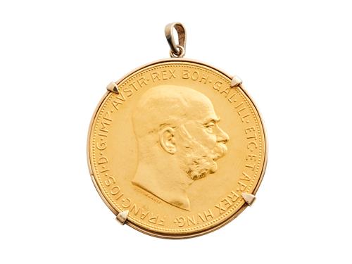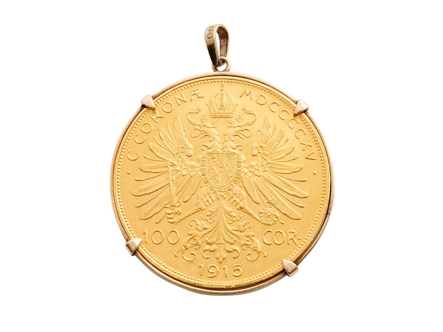 The 1915 100 Corona Austrian coin (restrike), within a 9ct gold frame, diameter 38mm, gross weight approximately 36.1 grams.