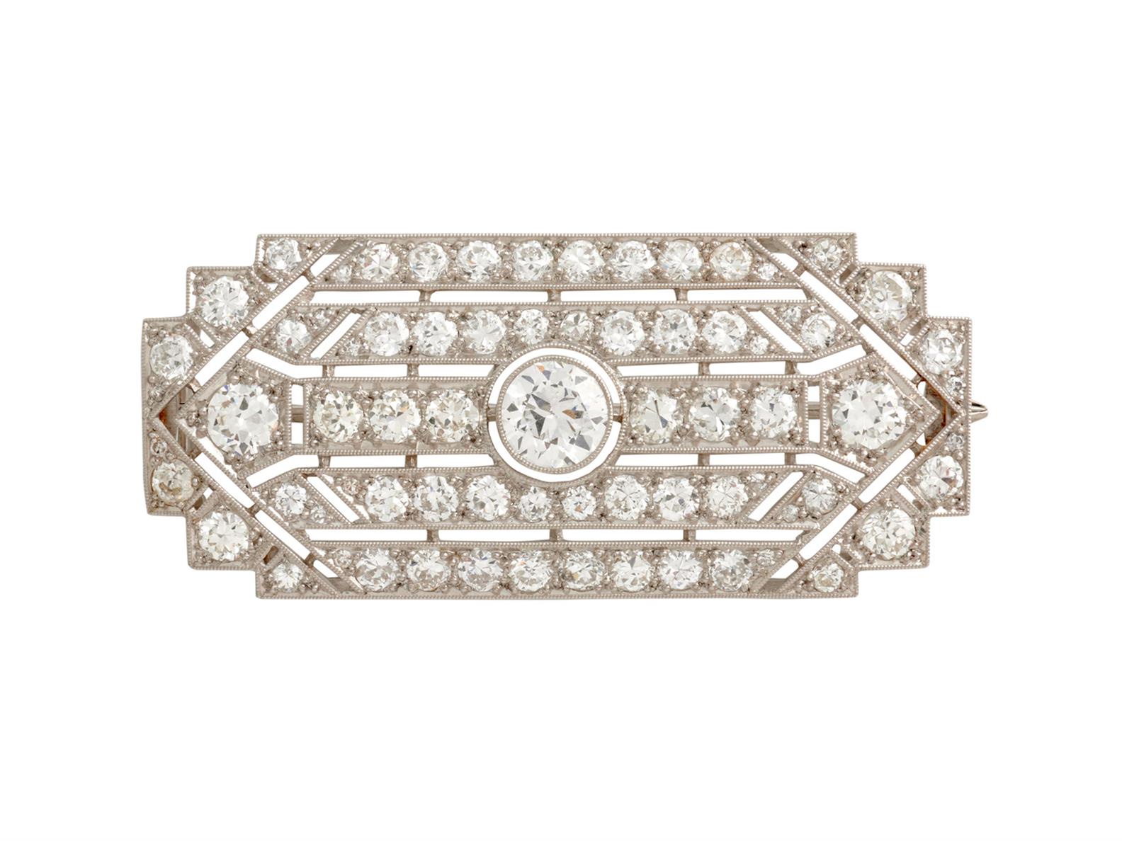 The geometric plaque, centring a collet-set old European-cut diamond weighing approximately 1.00 carat, the pierced surround millegrain-set throughout with further diamonds together weighing approximately 3.00 carats, length 22mm, width 49mm, gross weight 10.9 grams.