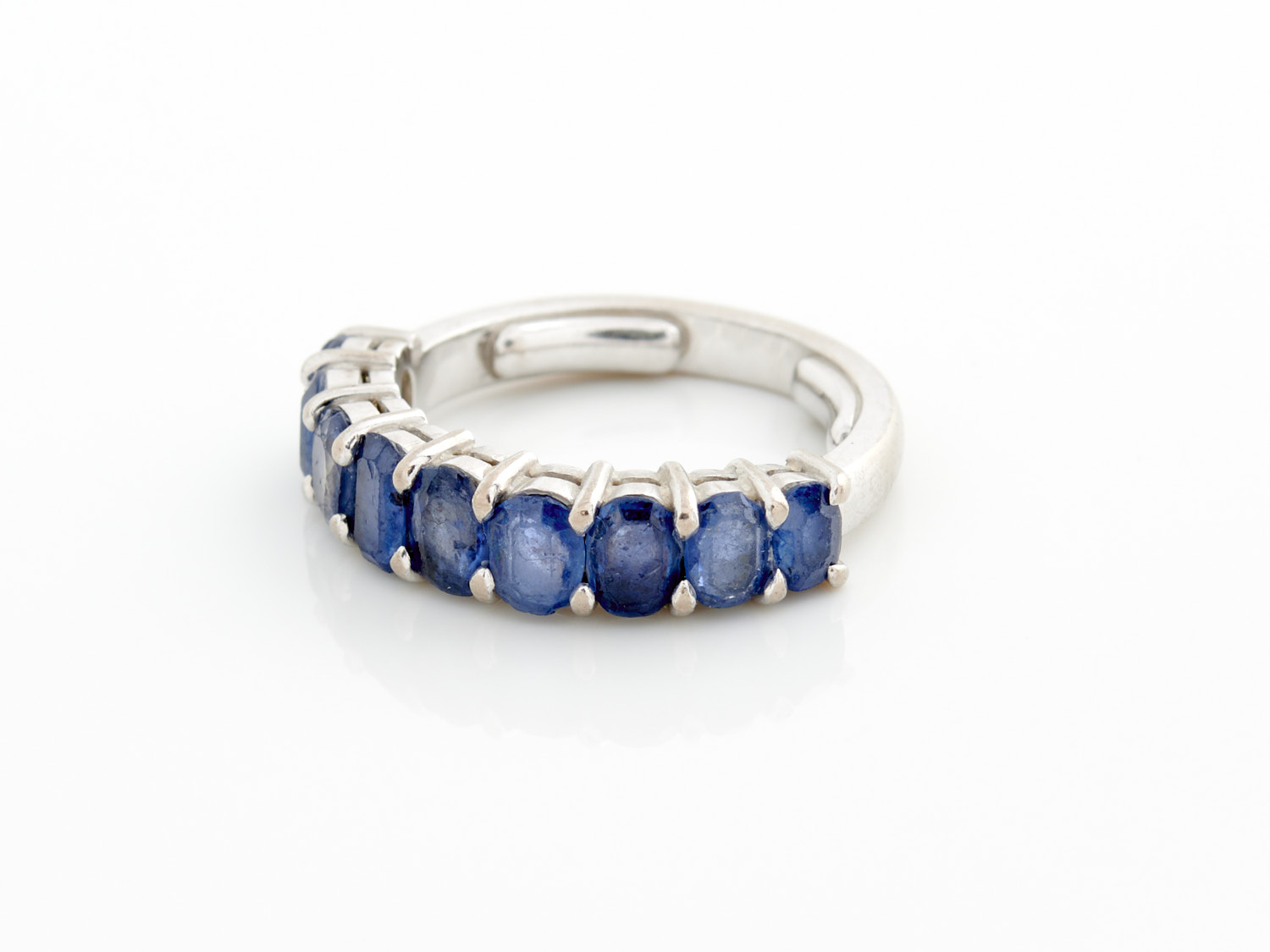 A NINE STONE SAPPHIRE RING IN 18CT WHITE GOLD, SIZE I, 5.40GMS