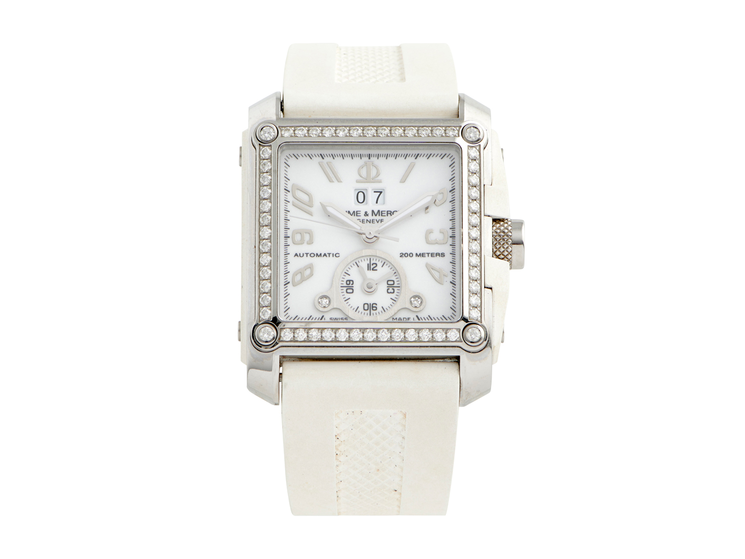 Closure: Baume & Mercier white rubber strap and double folding clasp
