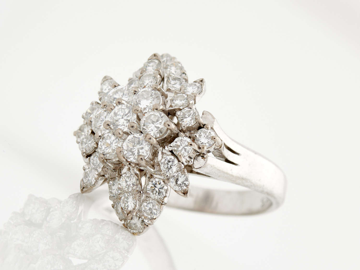 A DIAMOND CLUSTER RING IN 14CT WHITE GOLD, SIZE Q, 9.30GRAMS