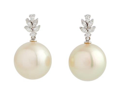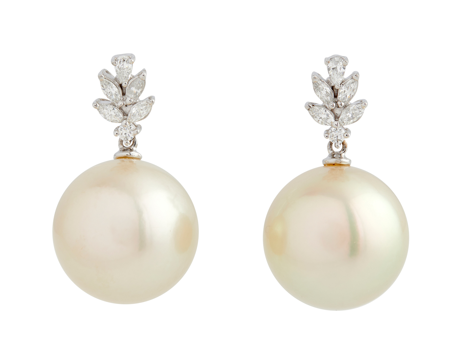 Each earring comprising a round pearl of cream white hues measuring approximately 15.20mm, suspended below a foliate diamond drop, the diamonds together weighing approximately 0.36 carats, to post and butterfly fittings, length 27mm.