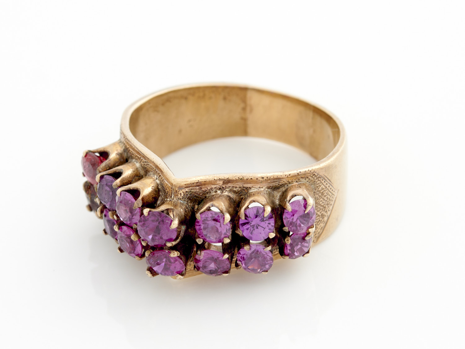 A RUBY RING IN LOW CARAT GOLD, SIZE L
