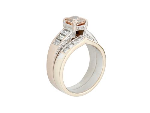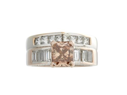 Comprising two fused bands, one centring a claw-set radiant-cut champagne diamond weighing 1.48 carats, flanked by baguette-cut diamonds with brilliant-cut diamond detail to underbezel, the second band channel-set with princess-cut diamonds, the colourless diamonds together weighing approximately 2.13 carats, size O.