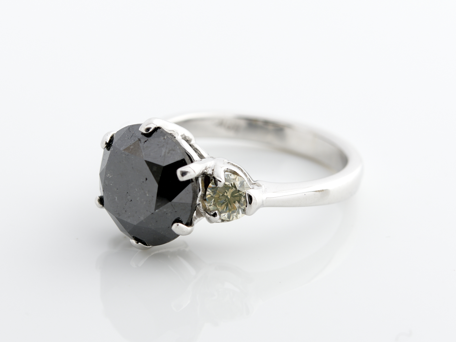 A BLACK DIAMOND AND DIAMOND RING IN 18CT WHITE GOLD, THE BLACK DIAMOND WEIGHING 5.1CTS, THE DIAMONDS WEIGHING 0.5CTS, SIZE M, ACCOMPANIED BY A VALUATION