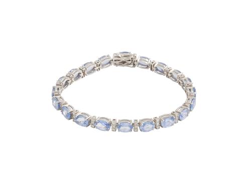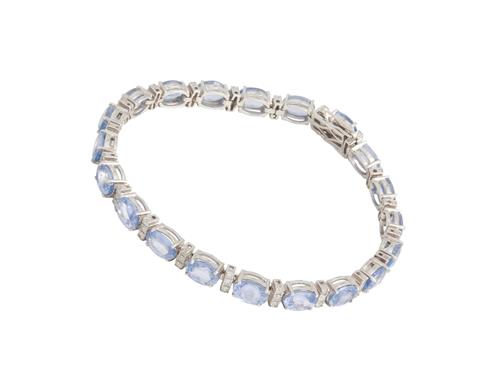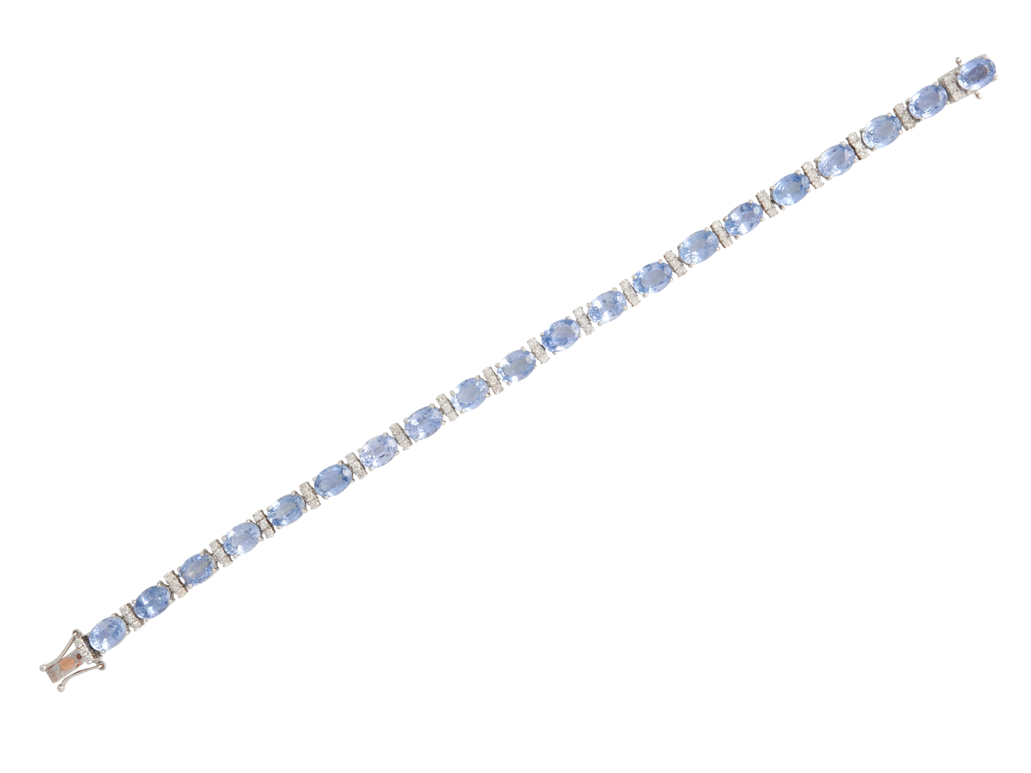 Designed as a continuous line of claw-set oval-cut sapphires, each spaced by a row of three brilliant-cut diamonds, the sapphires together weighing approximately 18.67 carats, the diamonds together weighing approximately 0.93 carats, completed by a tongue and groove clasp, length approximately 190mm, gross weight approximately 17.5 grams.