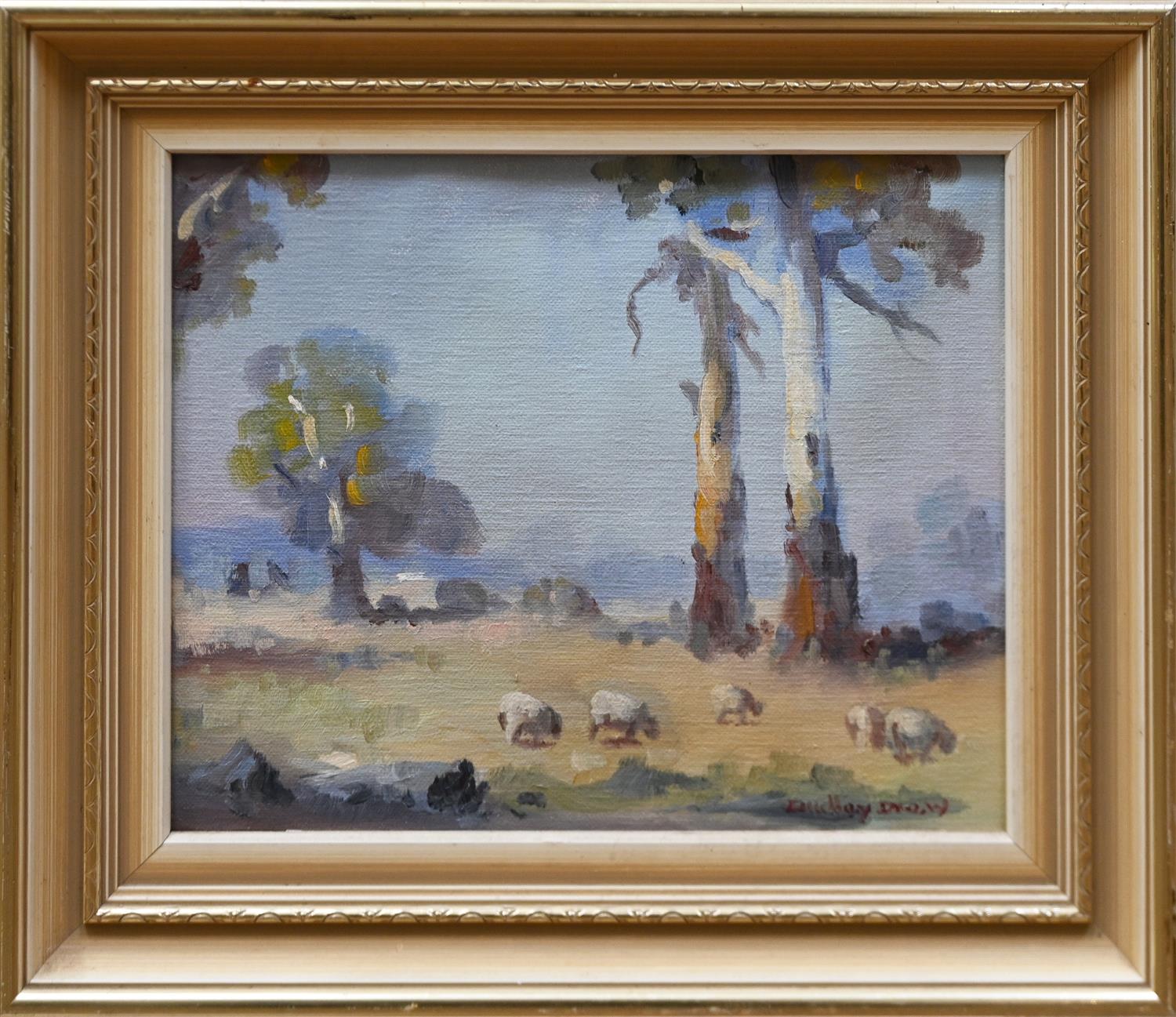DUDLEY DREW, (SHEEP GRAZING), OIL ON CANVAS LAID ON BOARD, SIGNED LOWER RIGHT, 24 X 28.5CM, FRAME SIZE: 35 X 40CM