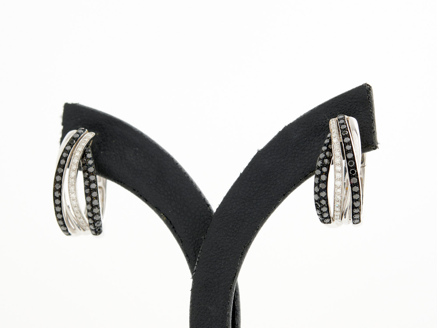 A PAIR OF BLACK DIAMOND AND DIAMOND HUGGIES IN 14CT WHITE GOLD, TO POST AND LEVER BACK FITTINGS