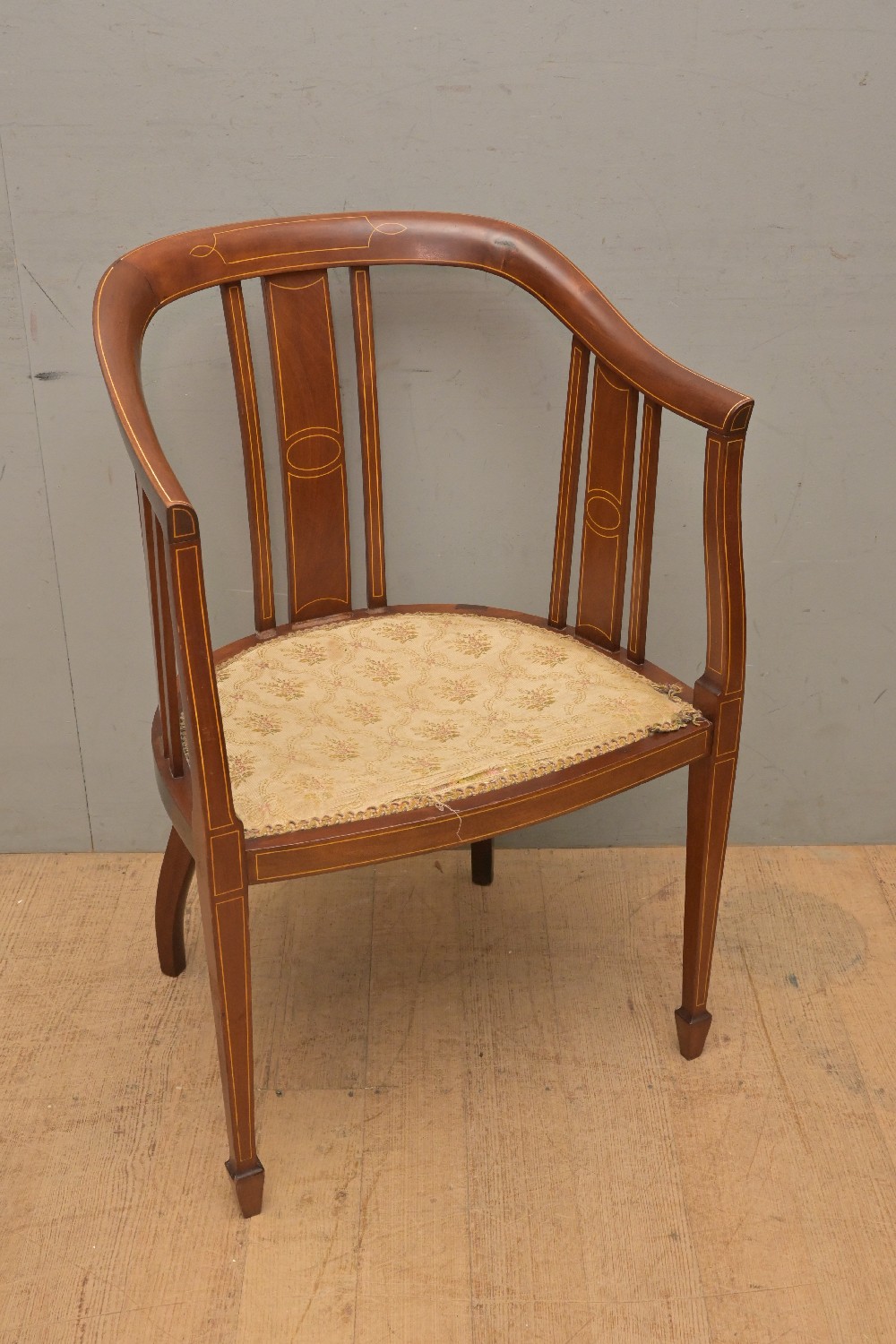 AN EDWARDIAN INLAID BOW-BACK ARMCHAIR (A/F) (85H X 57W X 49D CM) (LEONARD JOEL DELIVERY SIZE: LARGE)