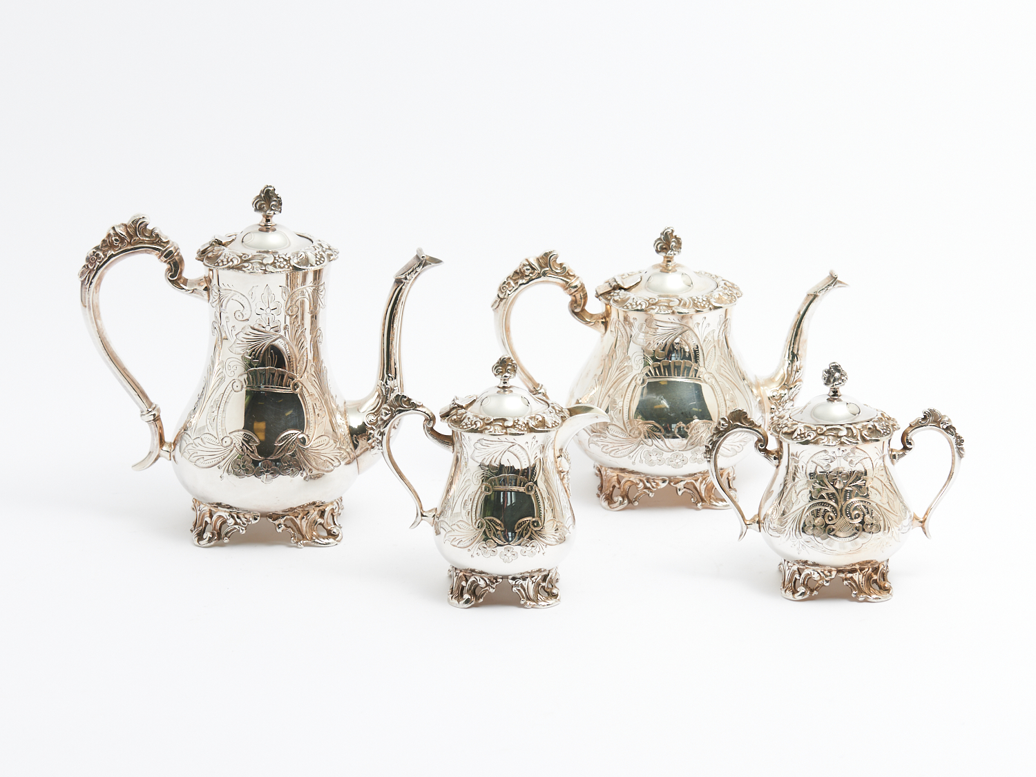AN EARLY 20TH CENTURY AUSTRALIAN FOUR PIECE HEAVILY EMBOSSED ENGRAVED SILVER PLATE TEA AND COFFEE SERVICE BY HACKER H.22.5CM (TALLEST), LEONARD JOEL LOCAL DELIVERY: MEDIUM