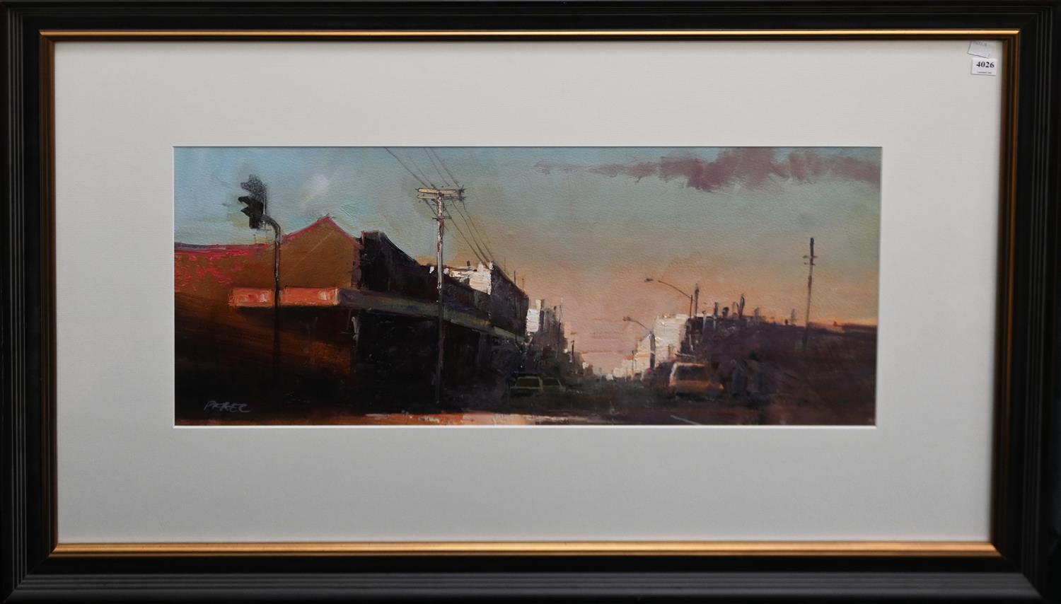 HERMAN PEKEL, AFTERNOON STREETSCAPE, WATERCOLOUR AND GOUACHE ON PAPER, SIGNED LOWER LEFT, 31 X 74CM, FRAME SIZE: 68 X 109CM