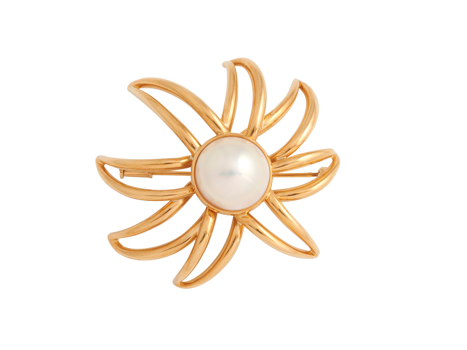 Centring a collet-set mabe pearl of white hues measuring approximately 13.50mm, within an open geometric surround, signed Tiffany & Co, 1994, length 50mm, width 45mm, gross weight approximately 25.6 grams.