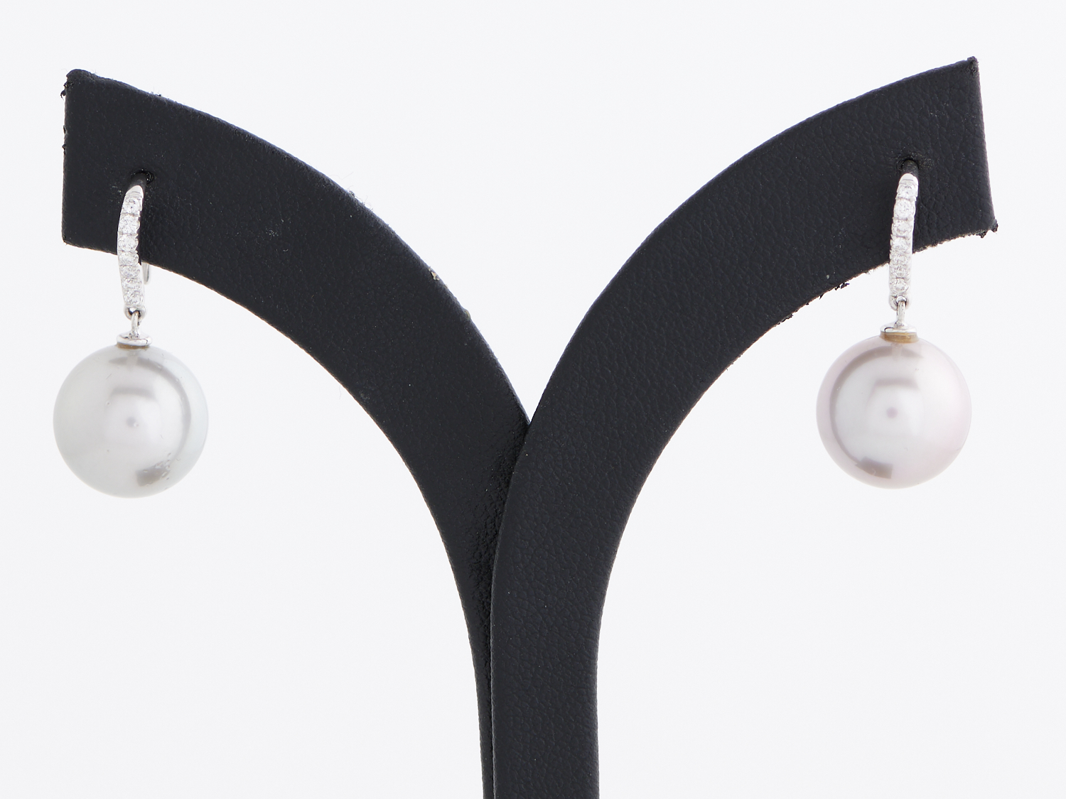 A PAIR OF TAHITIAN PEARL AND DIAMOND EARRINGS IN 18CT WHITE GOLD TO SHEPARD HOOK FITTINGS, THE DIAMONDS TOTALLING 0.14CTS, WITH PEARLS MEASURING 12.2MM