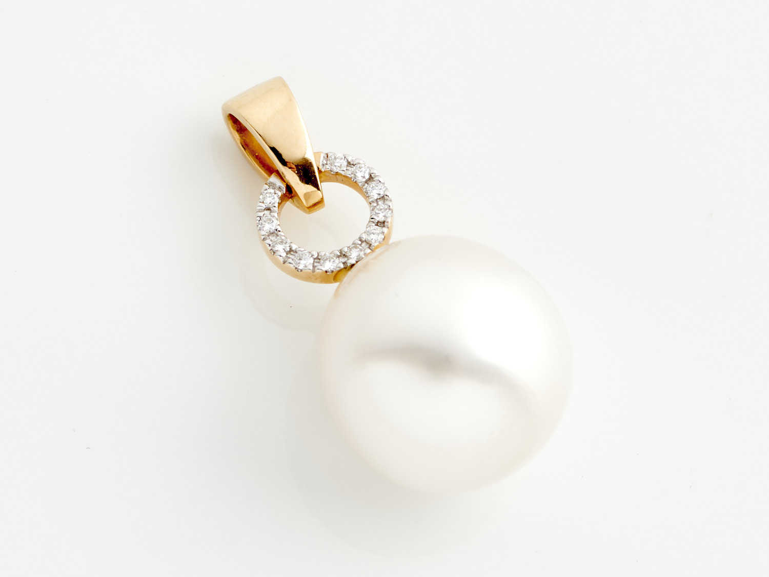 A SOUTH SEA PEARL AND DIAMOND PENDANT IN 14CT GOLD, THE DIAMONDS TOTALLING 0.06CTS, THE PEARL MEASURING 13.8 x 14.6MM